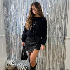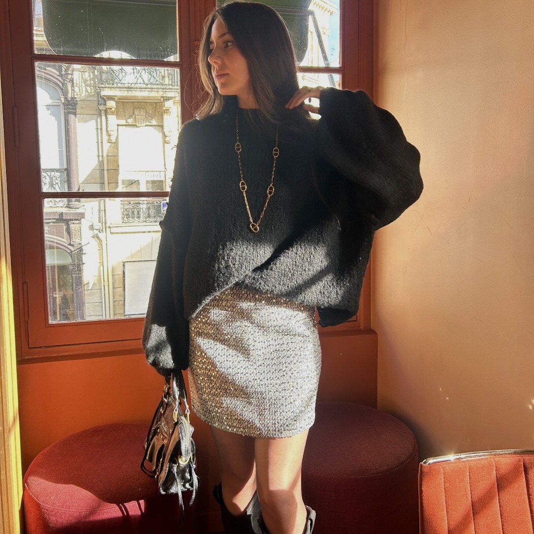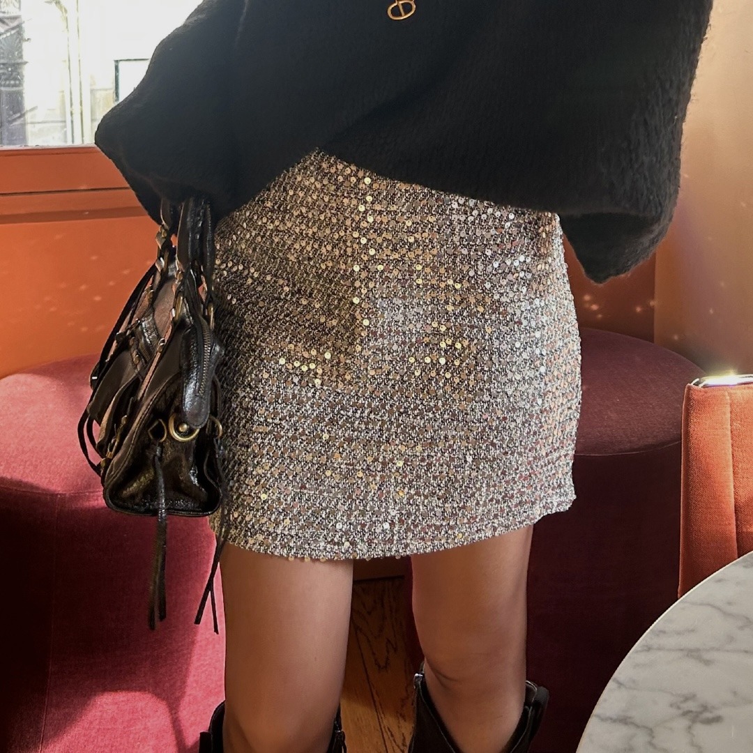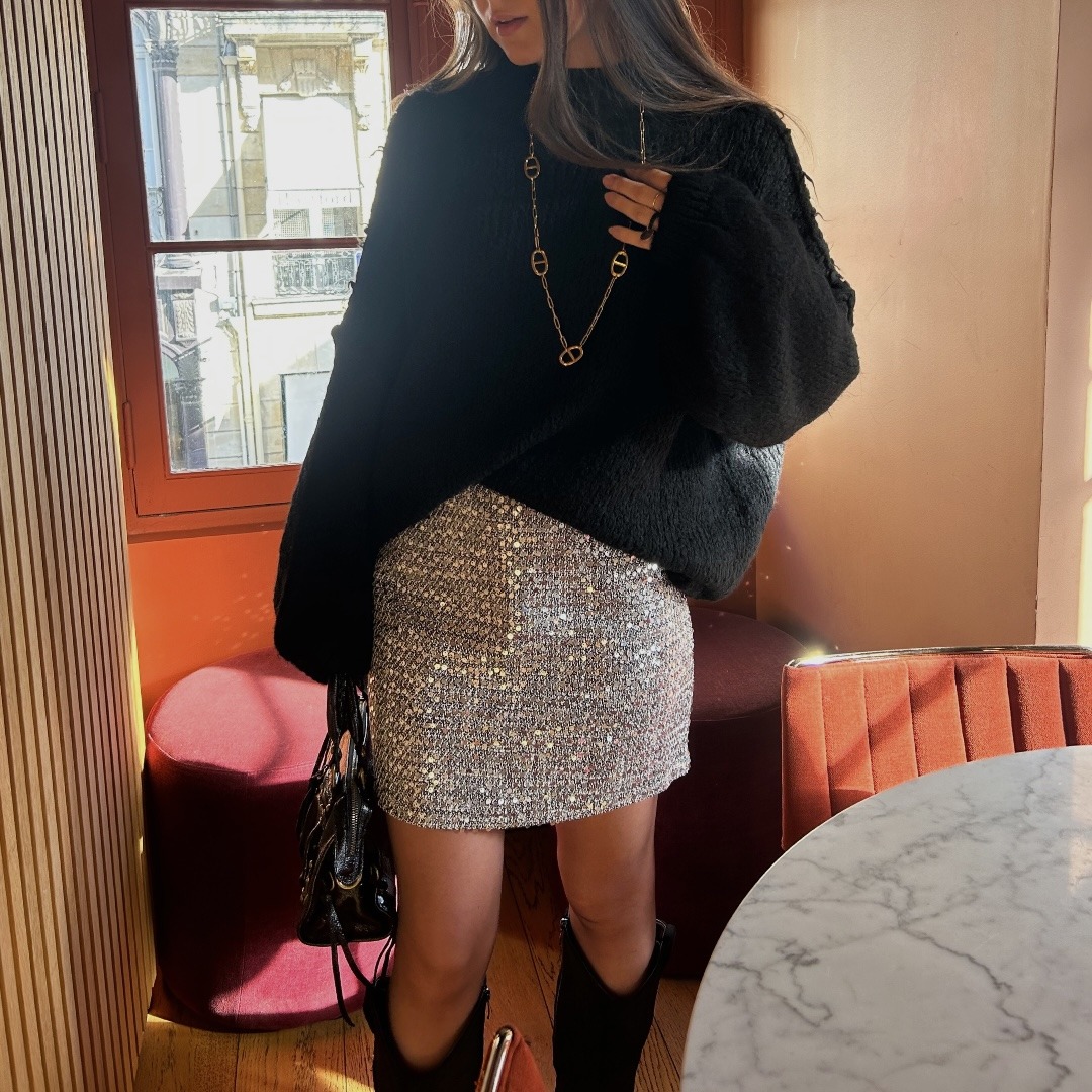 Cette jupe en tweed à sequins allie élégance et brillance, idéale pour un look chic et lumineux, que ce soit en journée ou en soirée !