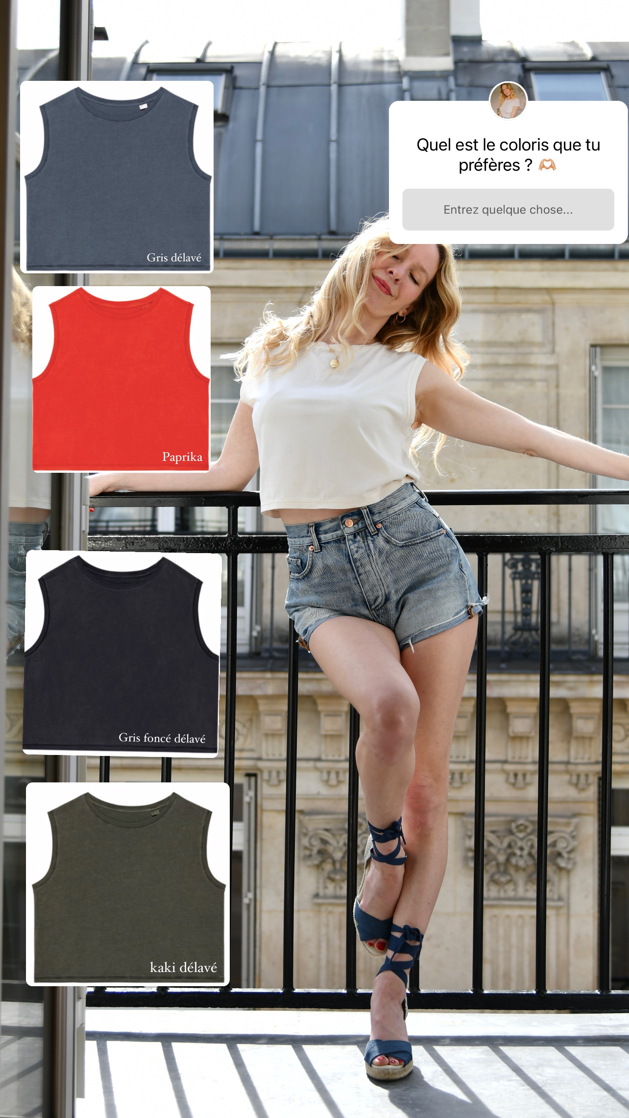 100% coton biologique, disponible en crème, gris clair, gris foncé, paprika et kaki – Conseil taille : choisir sa taille habituelle, le débardeur taille loose. Je porte la taille S