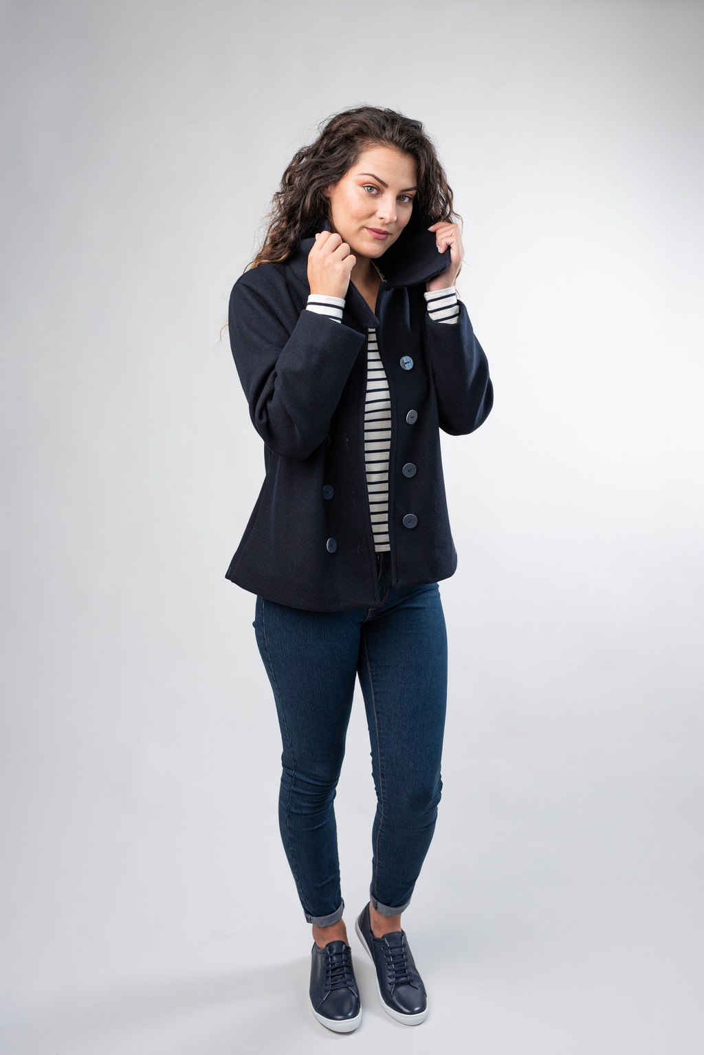 Ce manteau bleu marine mi-long en caban est une belle pièce à manches longues. Il vous accompagnera dans toutes les saisons. Ce manteau est inspiré des cabans de marins et revisité par Mainlynes Blue.