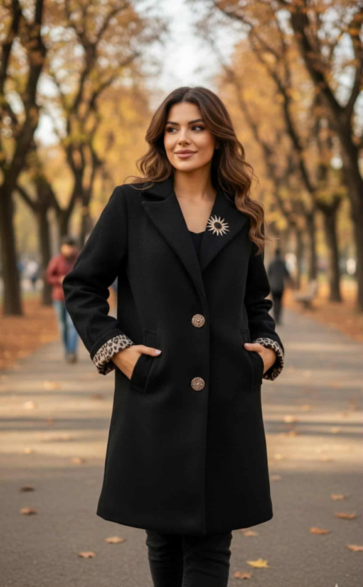Manteau noir et léopard avec broche soleil du S au 5xl
