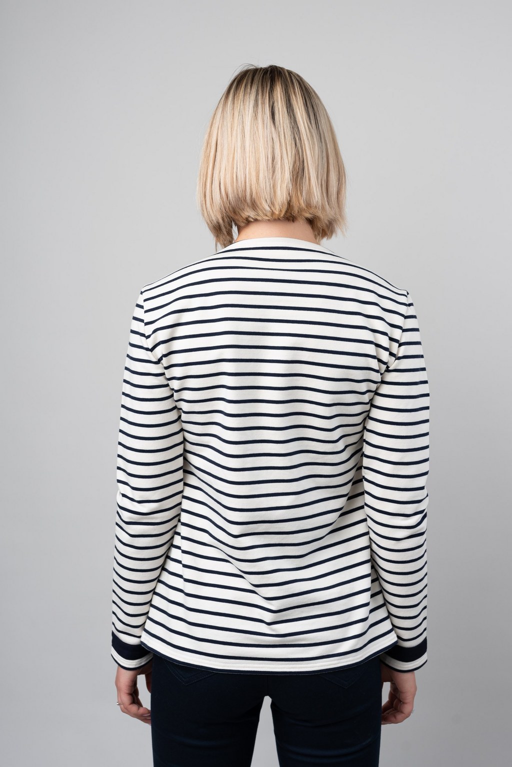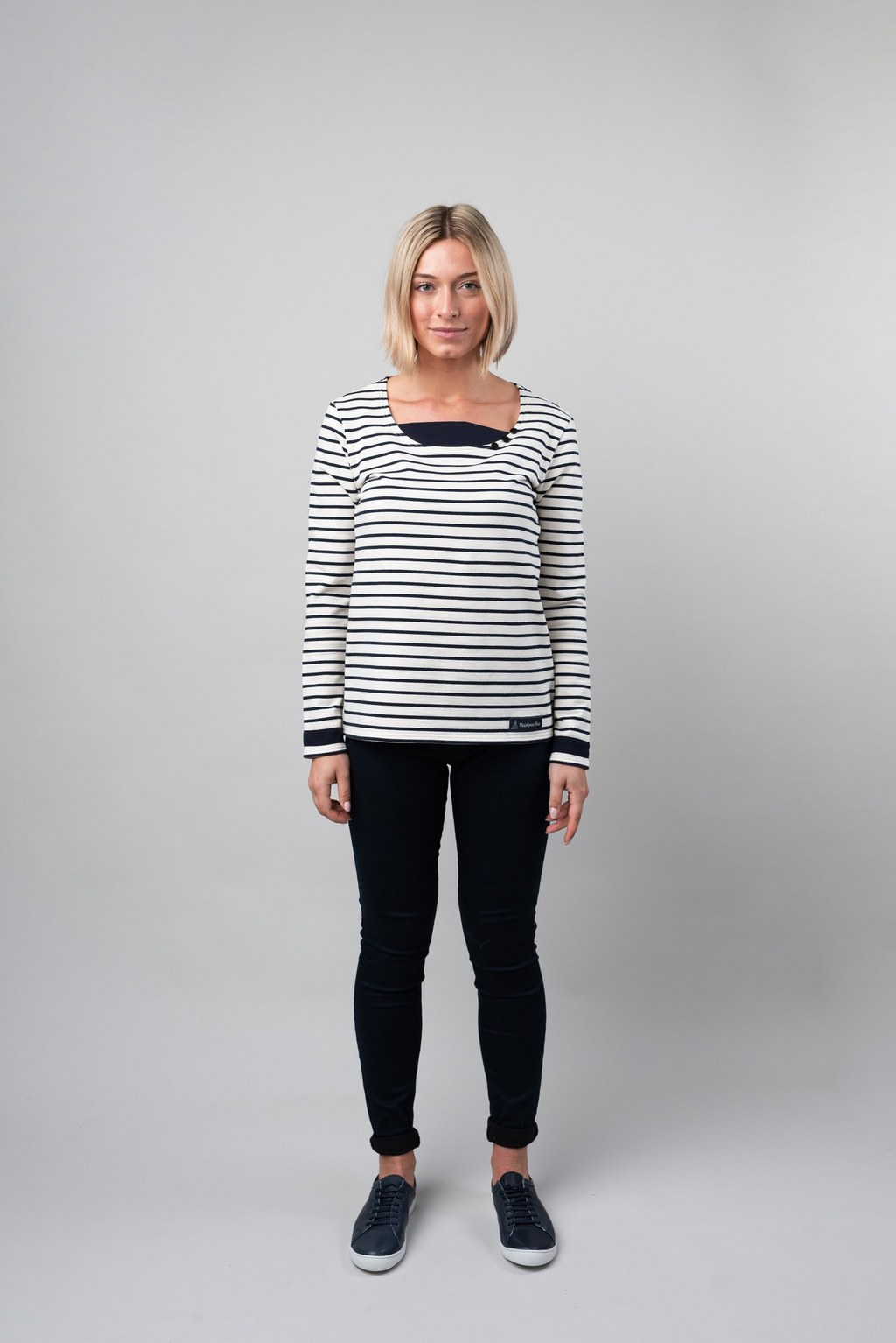 Cette marinière (Jersey label OEKO -TEX) aux belles couleurs de la mer se démarque par son col rond en forme de bateau pour une élégance très appuyée.
