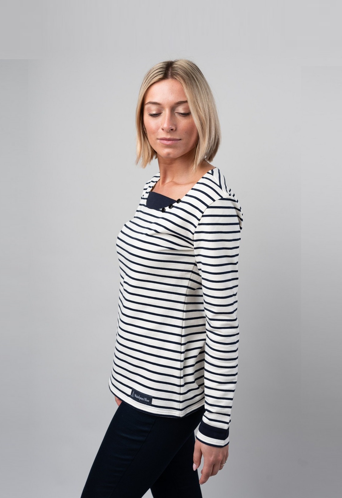 Cette marinière aux 3 boutons à manches longues pour femme lui donne un look et une coupe intemporelle. Sa petite bande bleu marine en bas des manches vient parfaire ce vêtement. Cette marinière aux belles couleurs de la mer se démarque par son col rond en forme de bateau avec son empiècement bleu marine habillé de 3 boutons bleu marine pour une élégance très appuyée.