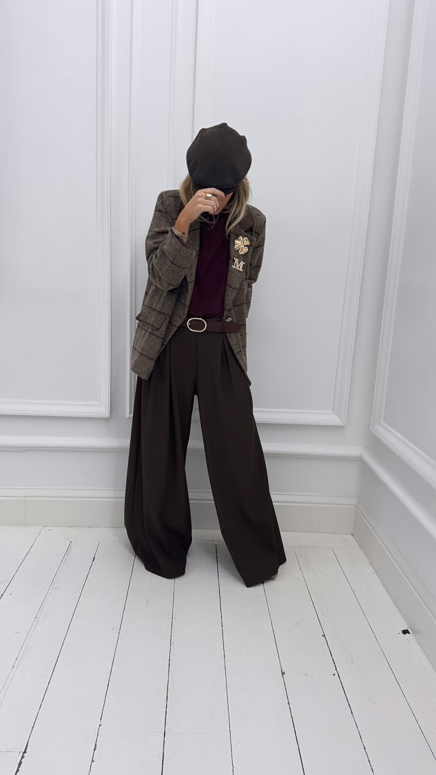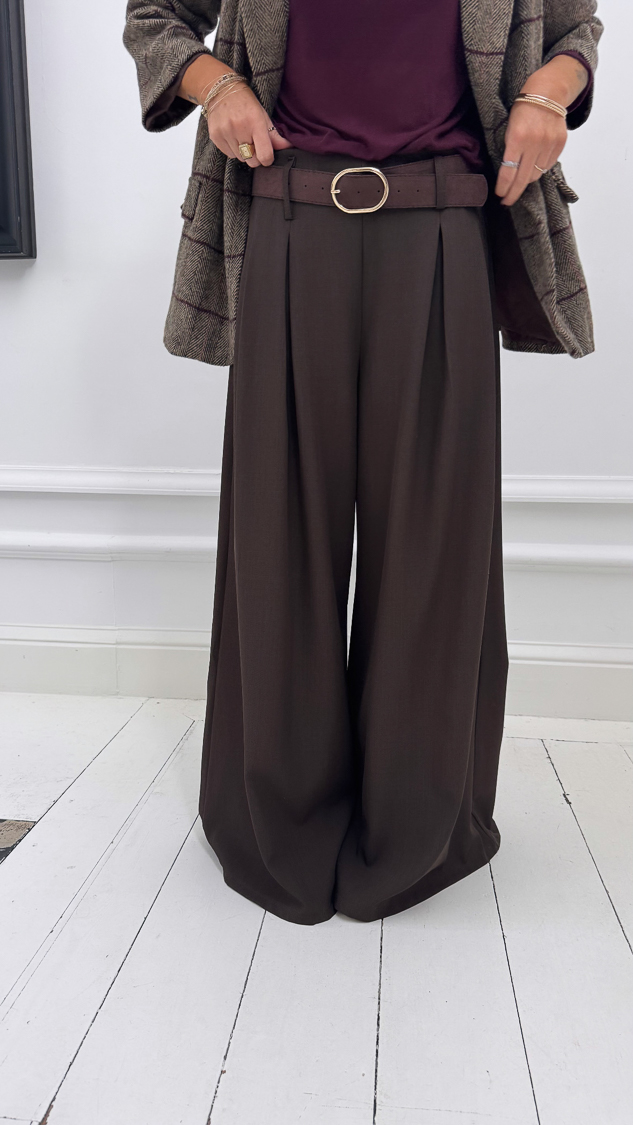 Ce pantalon large marron à pinces, ceinturé à la taille et élastiqué au dos, allie confort et élégance pour sublimer votre silhouette avec style!
