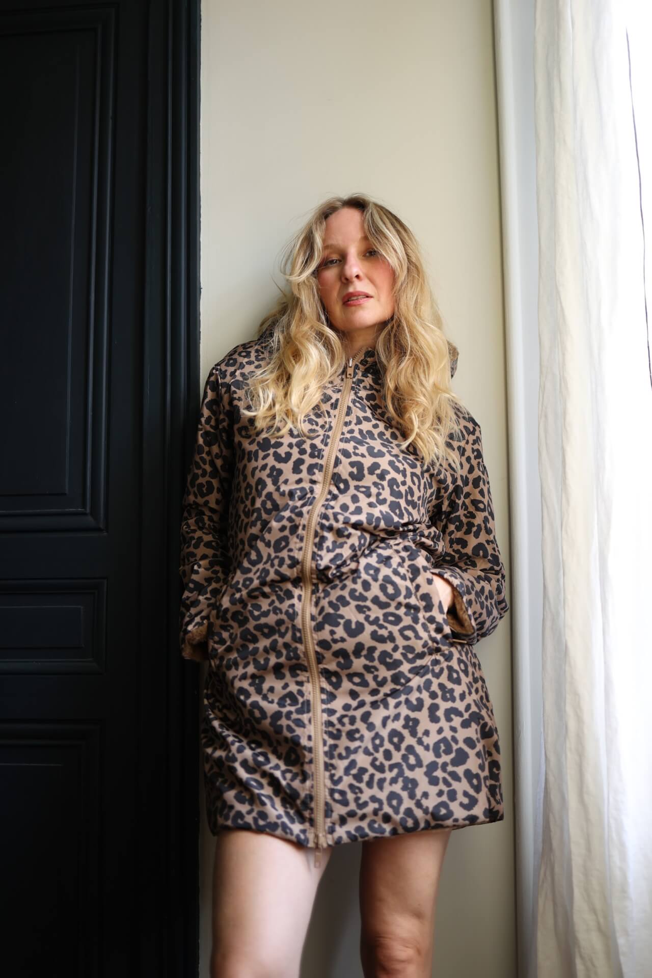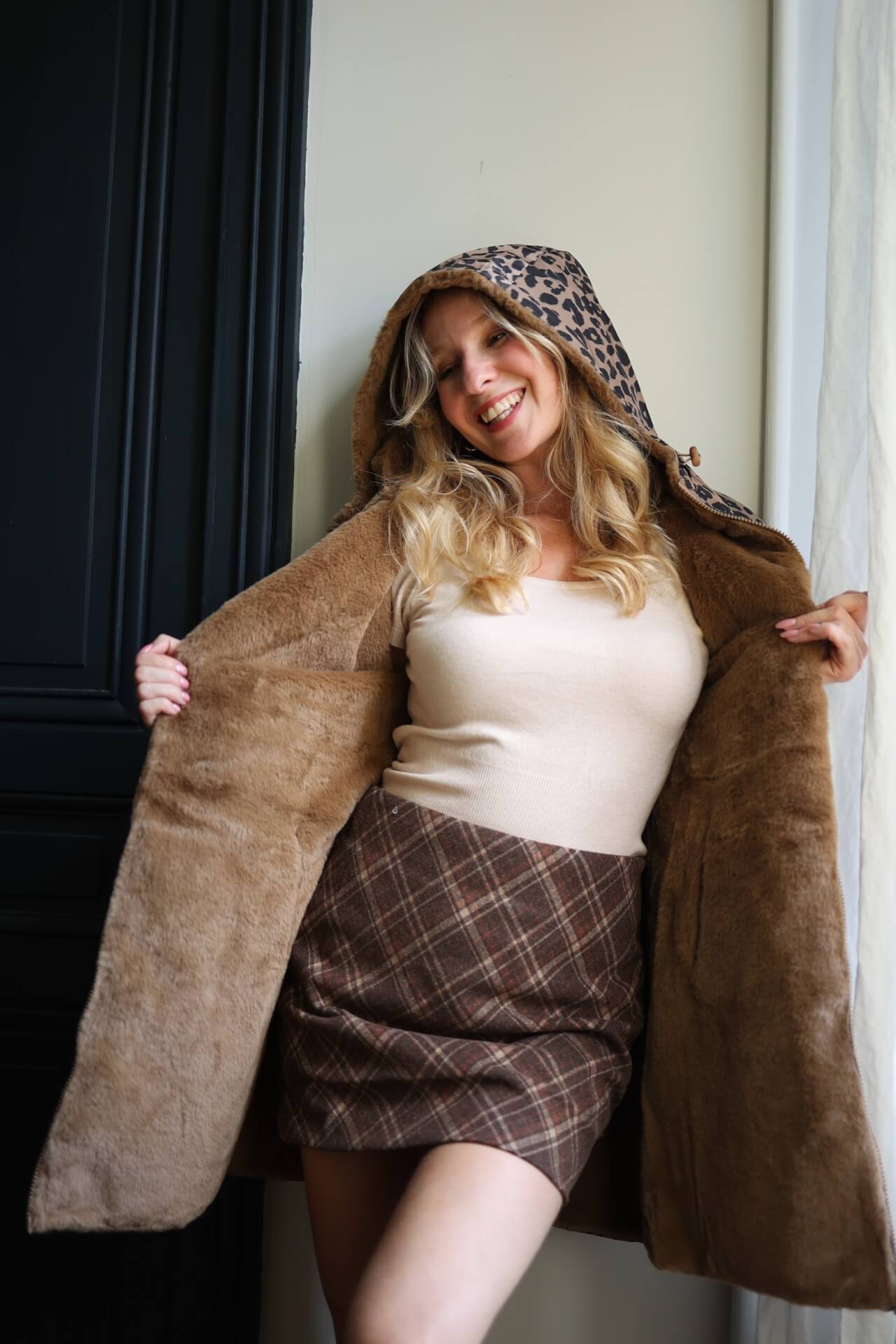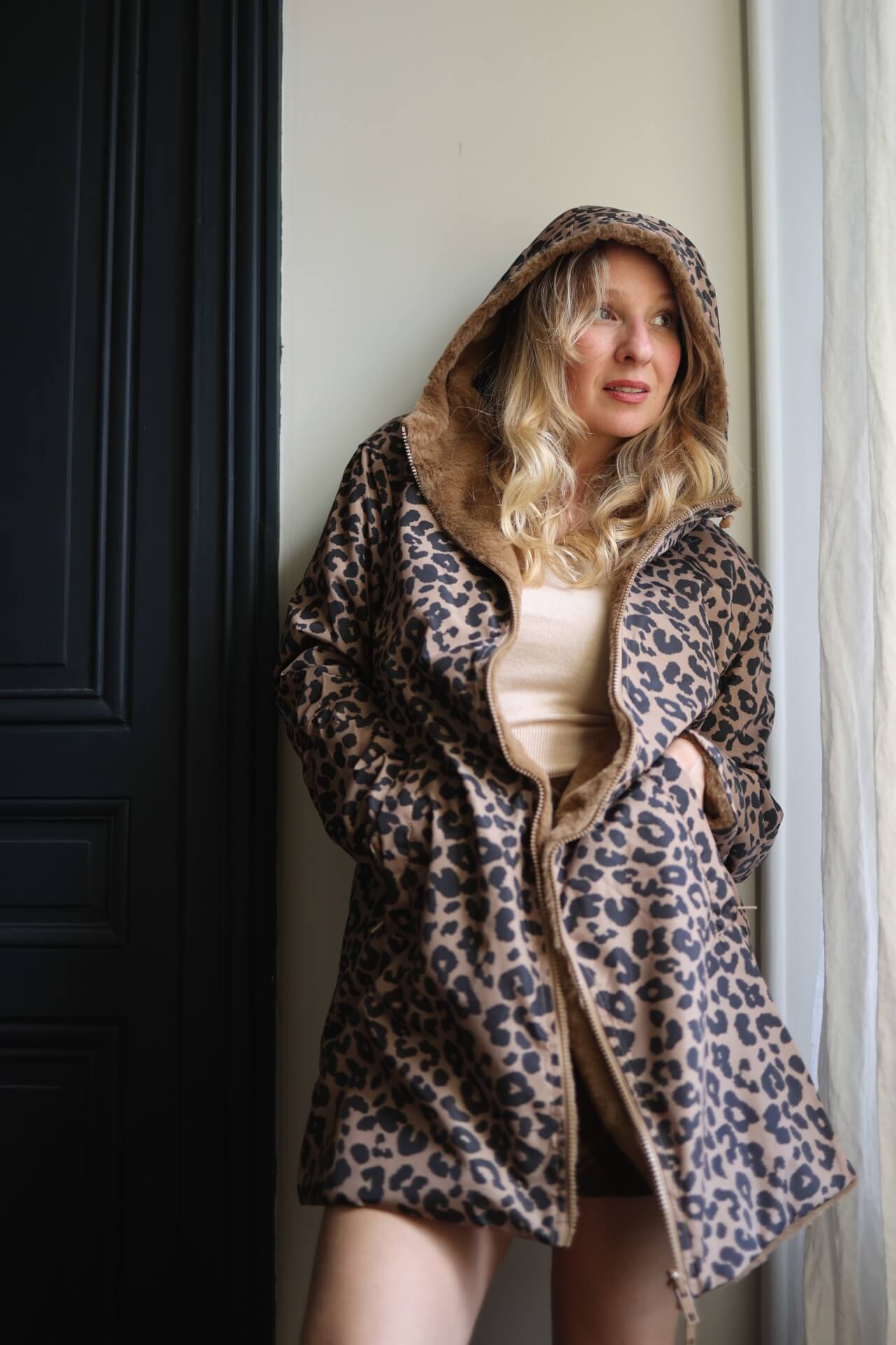 Parka mi-longue à capuche fourrée léopard réversible caramel