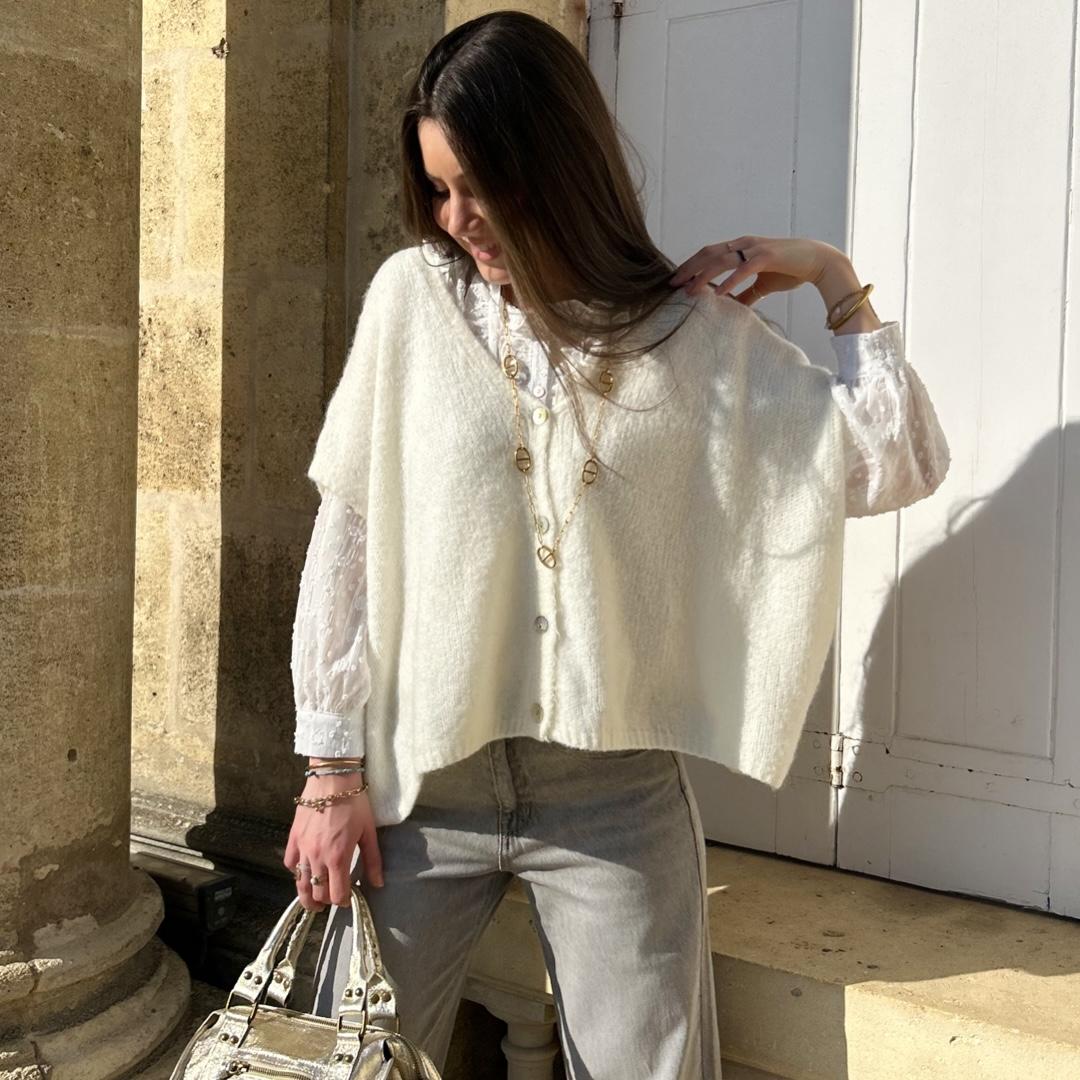 Adoptez un style chic avec ce pull sans manches en maille, sublimé par des boutons nacrés et un col V élégant. Idéal pour une tenue élégante et moderne en toute saison.