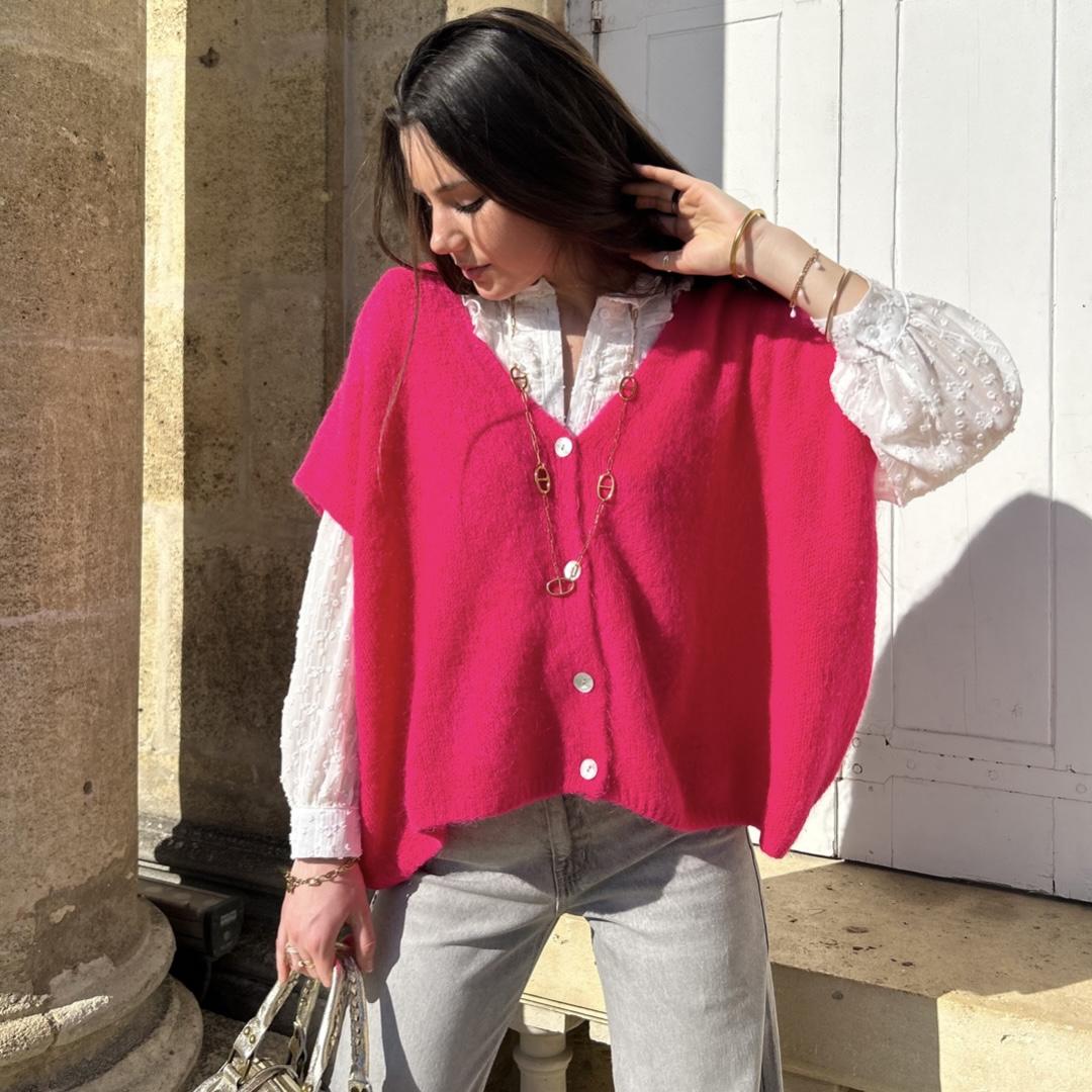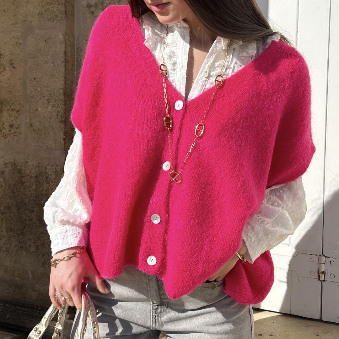 Adoptez un style chic avec ce pull sans manches en maille, sublimé par des boutons nacrés et un col V élégant. Idéal pour une tenue élégante et moderne en toute saison.