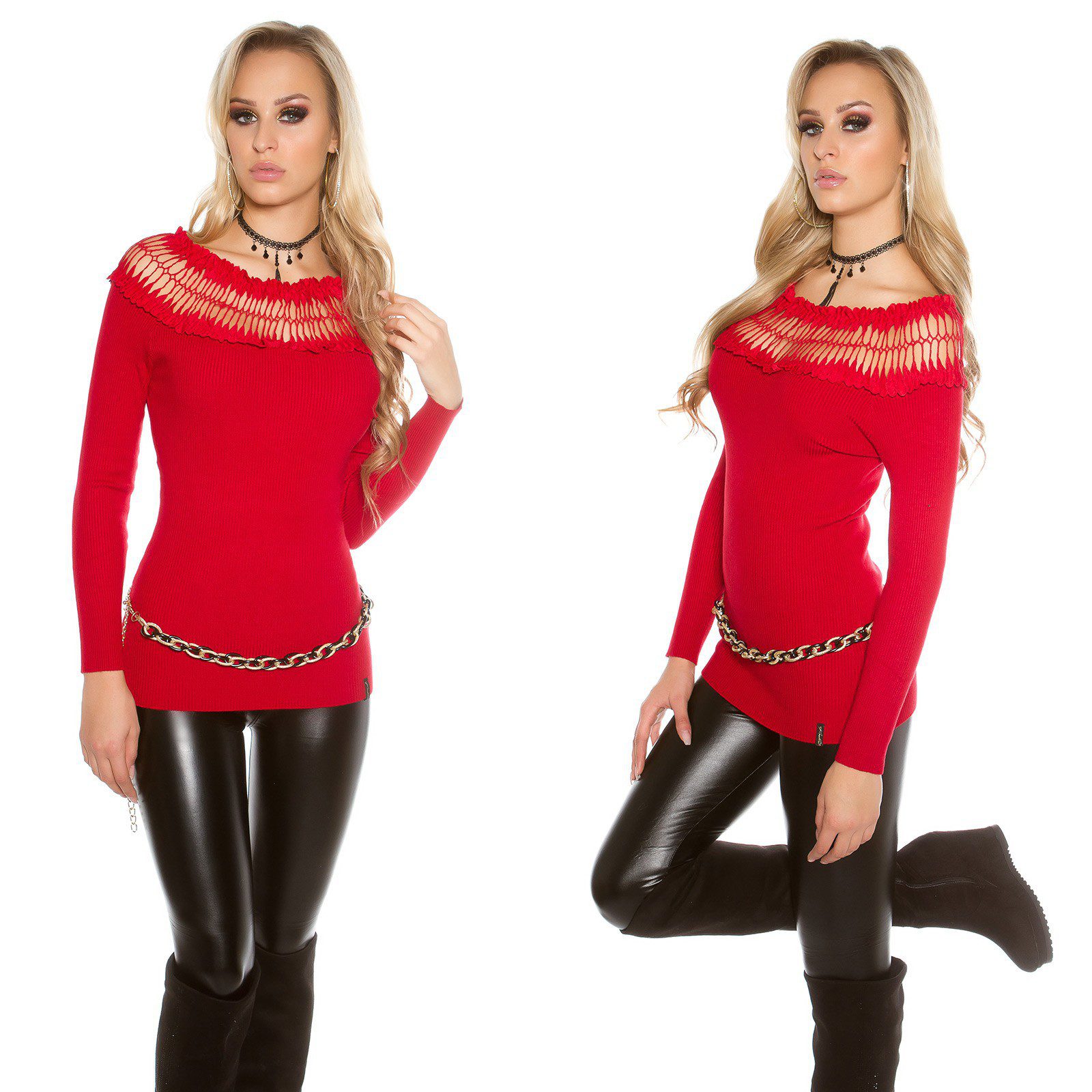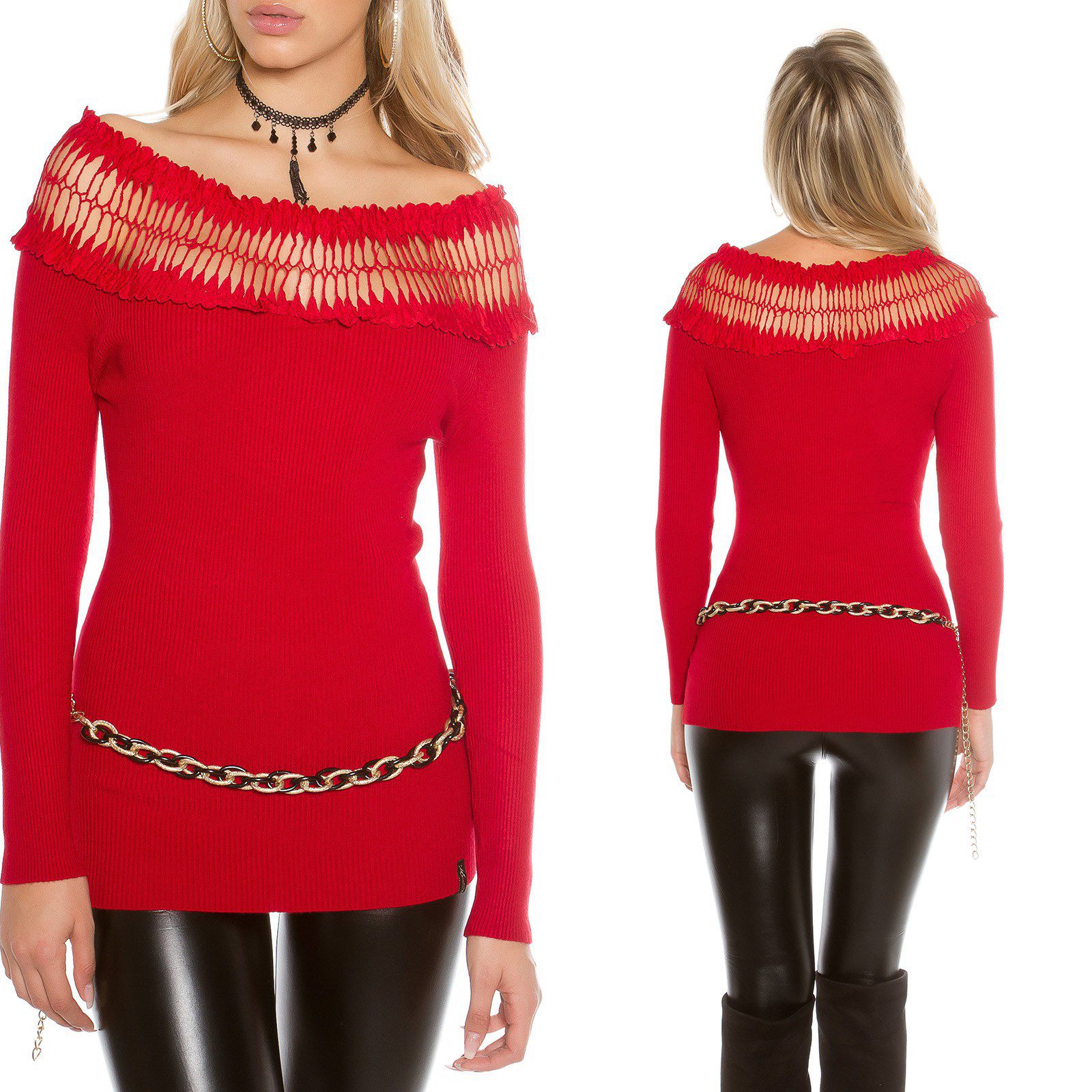 Pull col large brodé femme sexy ROMANE couleur rouge