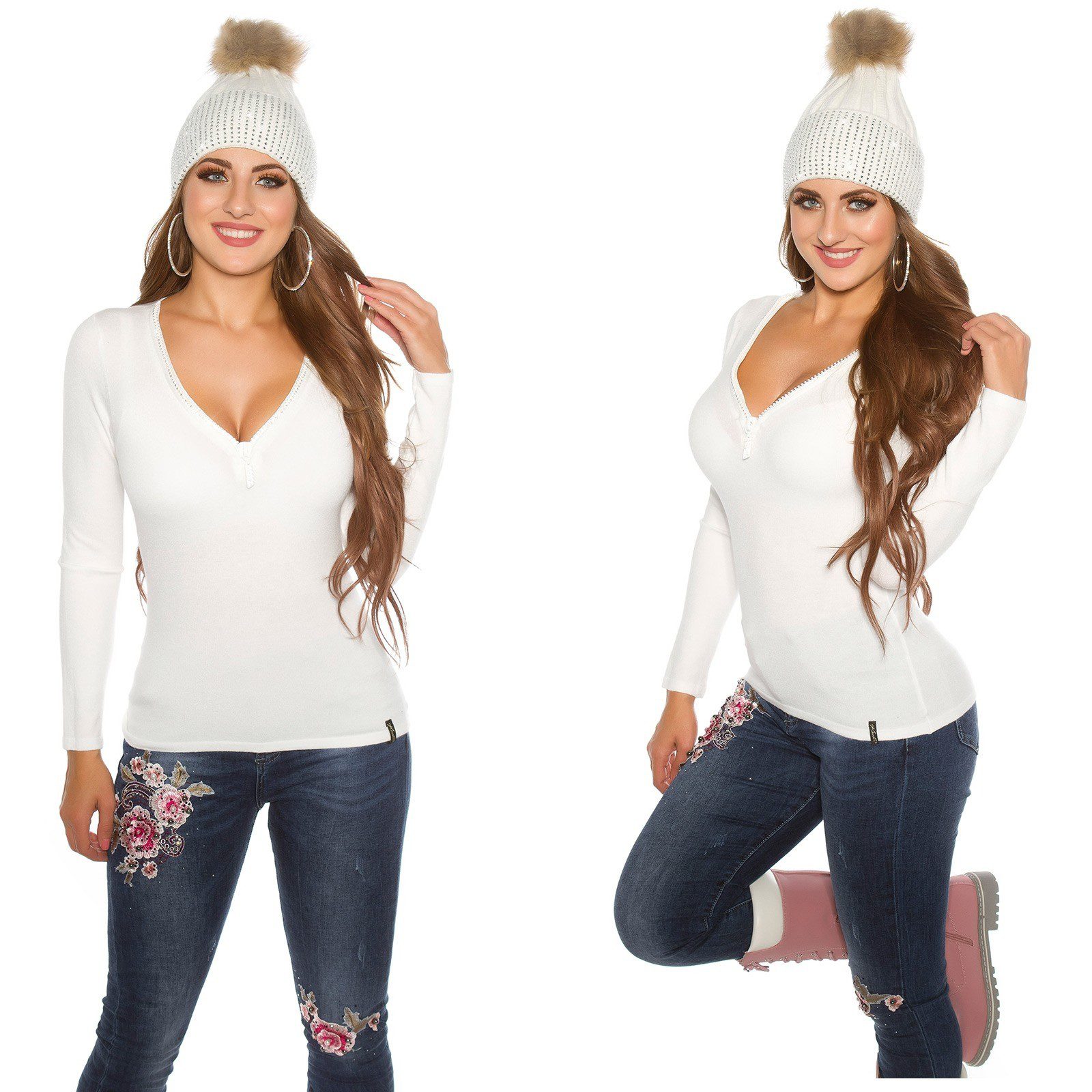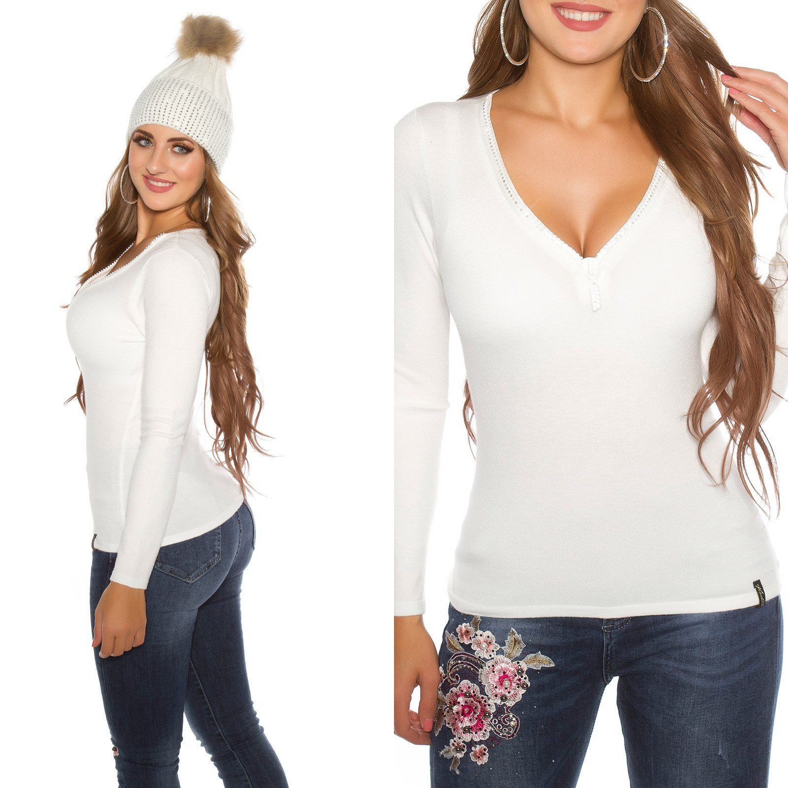 On craque sur ce pull au col en V et au Zip avec strass pour un style glamour et sexy dans toutes nos sorties avec un jean ou un leggings ou une jupe !
