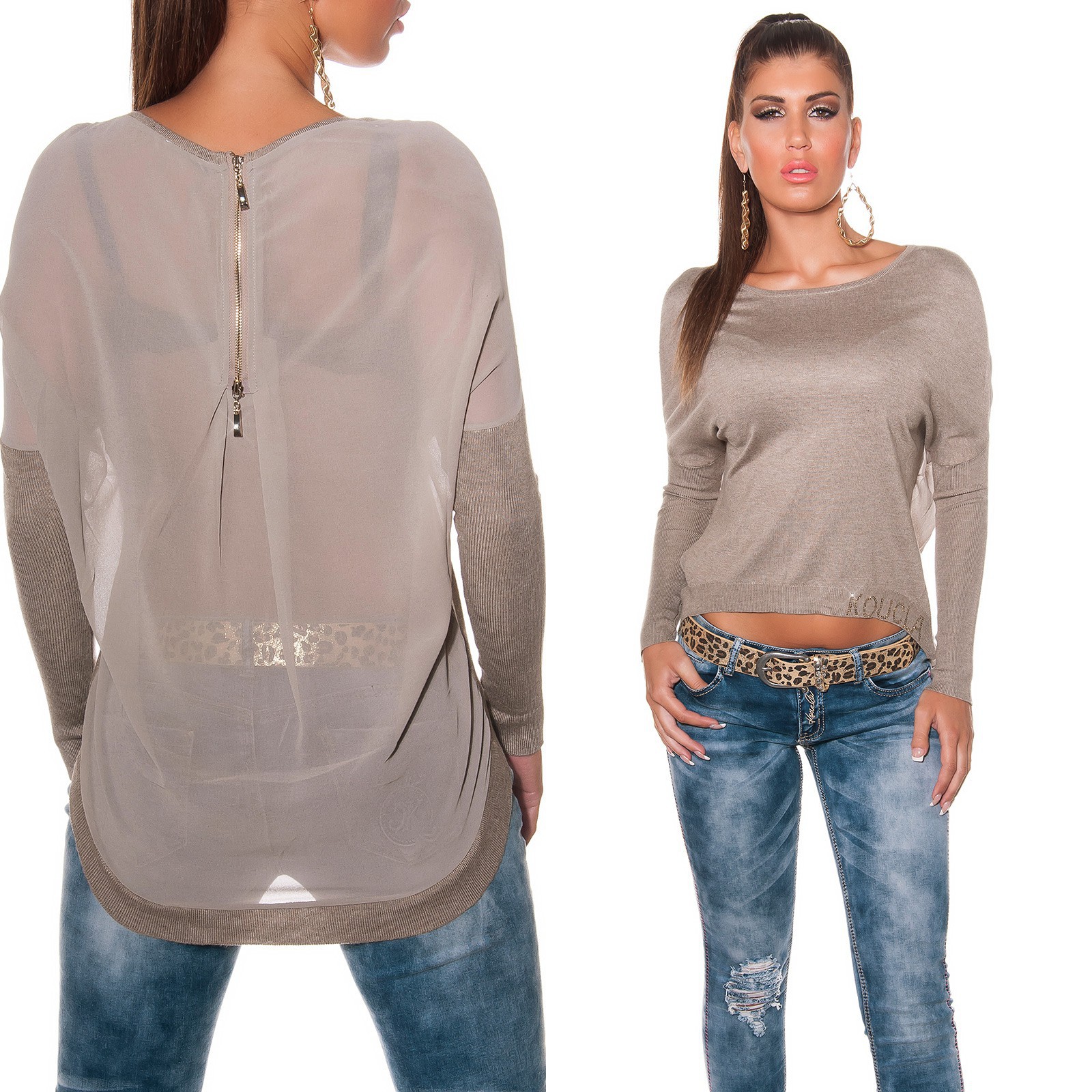 Pull long femme glamour strass et dentelle MATHILDE couleur taupe – vetement femme fashion sexy et tendance – toute la mode est sur New Fashion