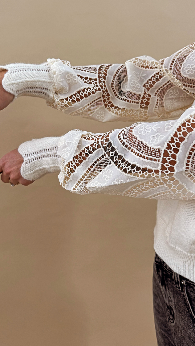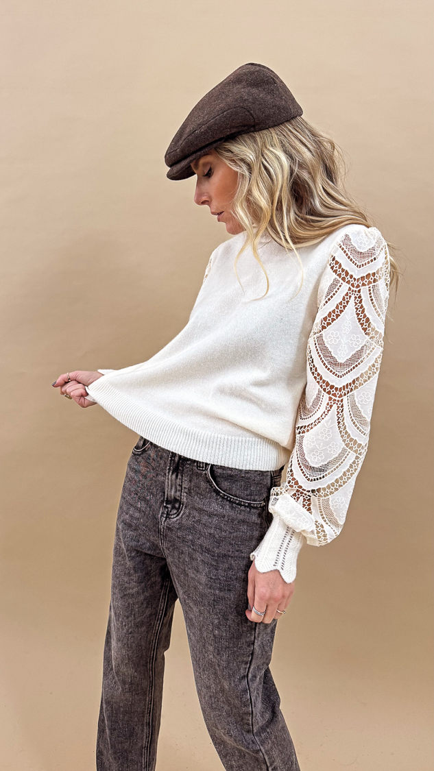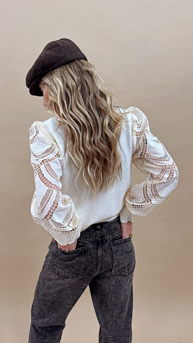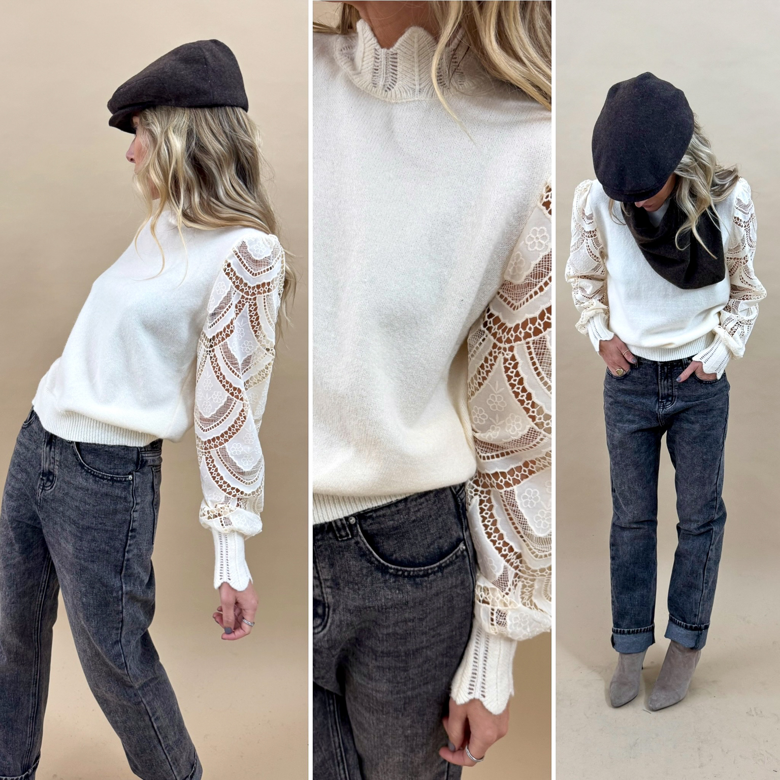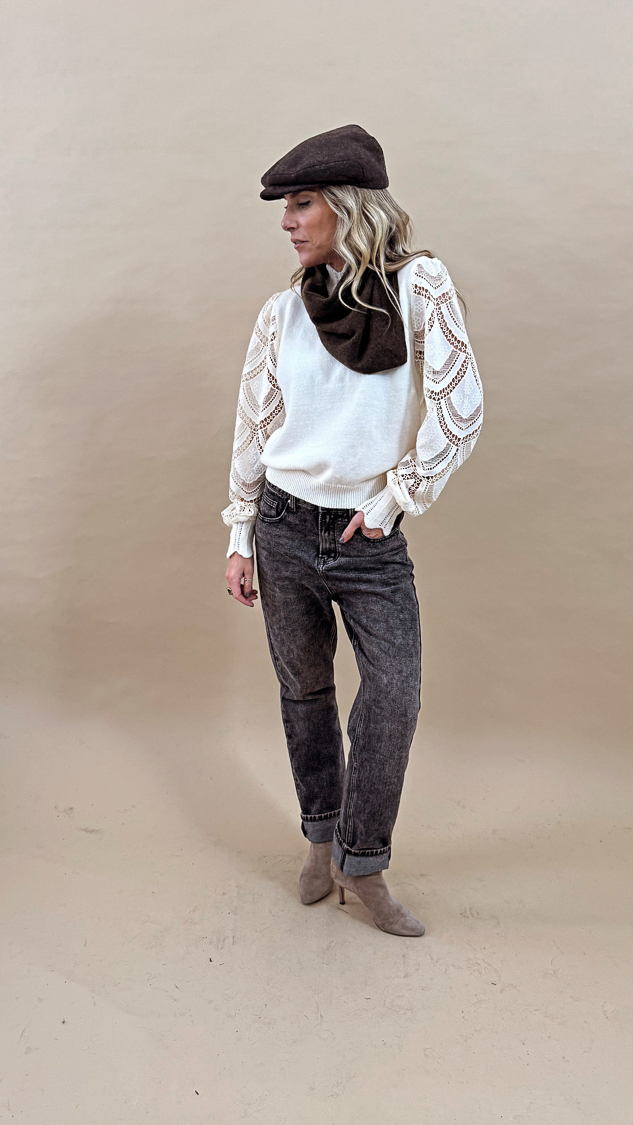 Le pull écru et ses manches brodées, sa maille douce est parfaite pour la mi-saison!
