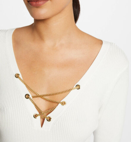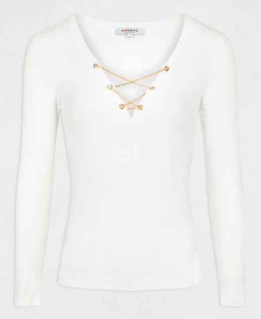 Pull manches longues, détails chaînes au niveau de l’encolure. Tricotage en côte.