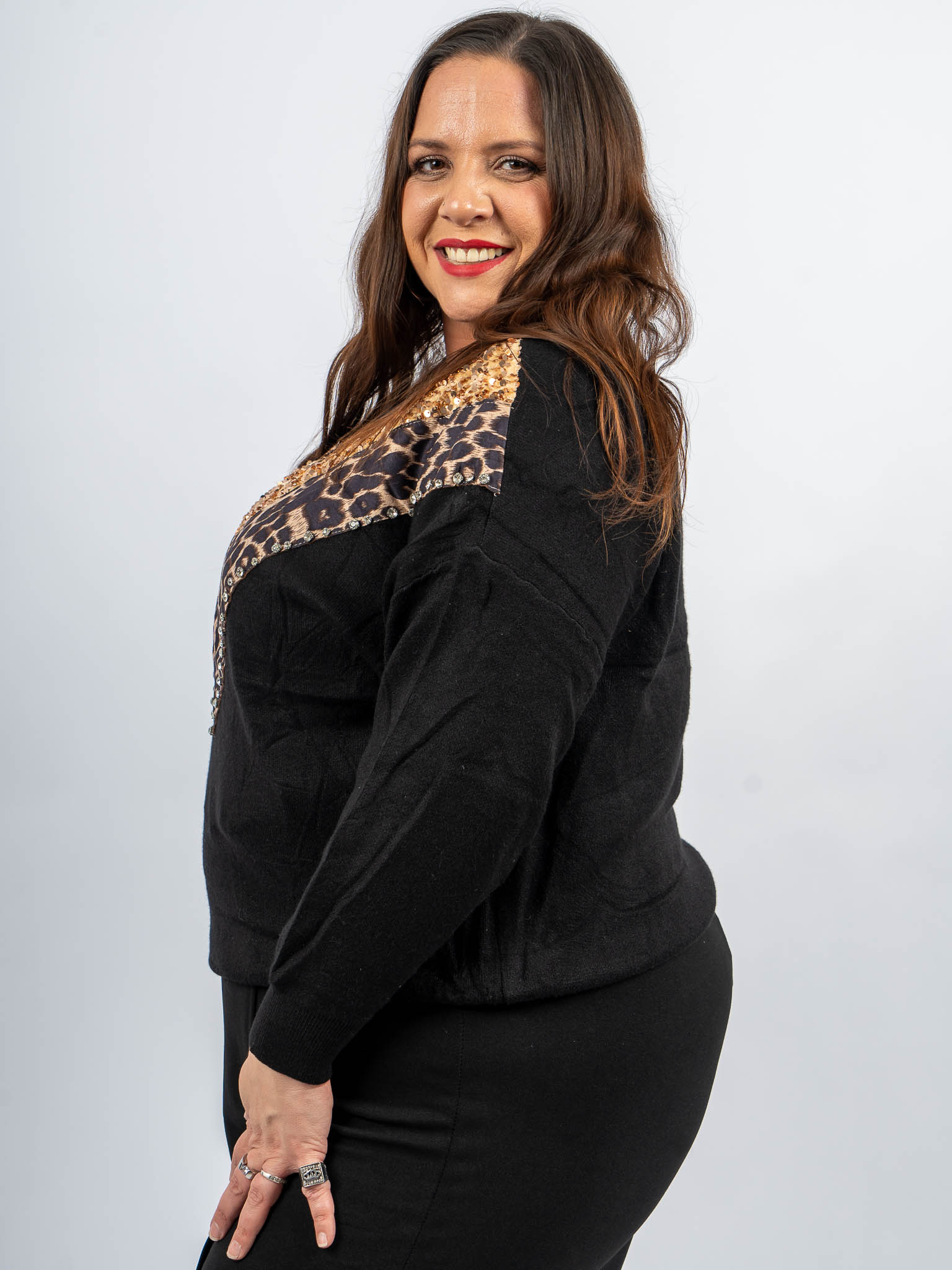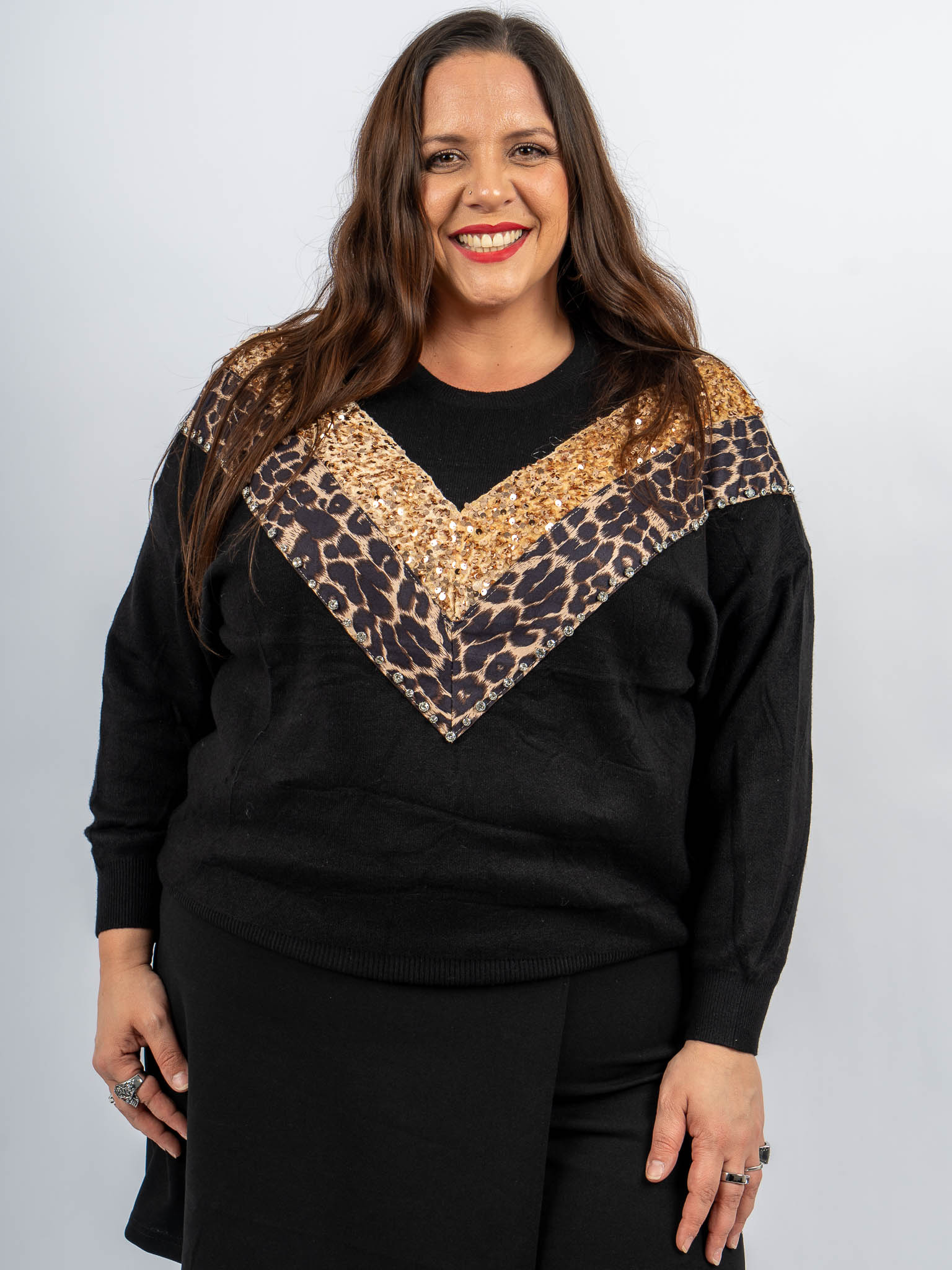 Pull noir motif sequins léopard