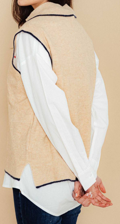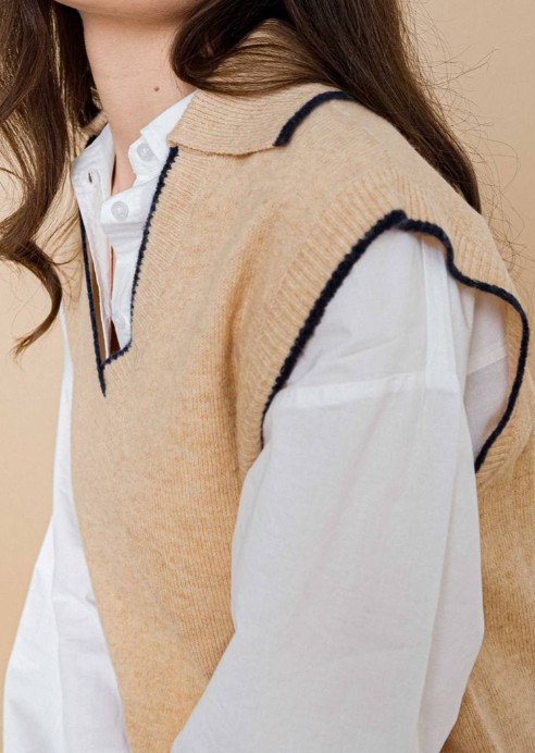 Pull sans manches avec col chemise. Col V. Liseret noir et fente sur les côtés.