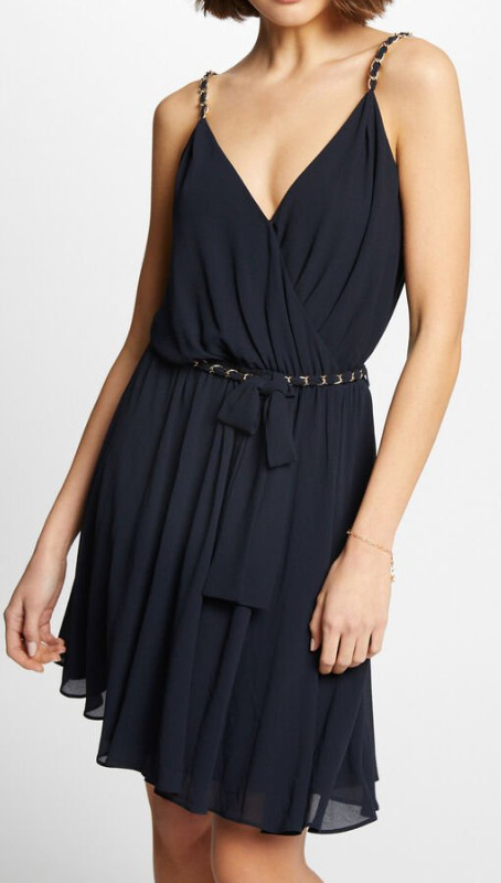Robe à bretelles, encolure cache-coeur fermée par un bouton pression. Détails chaînes au niveau des bretelles et de la ceinture. Fermeture invisible zipée au dos.