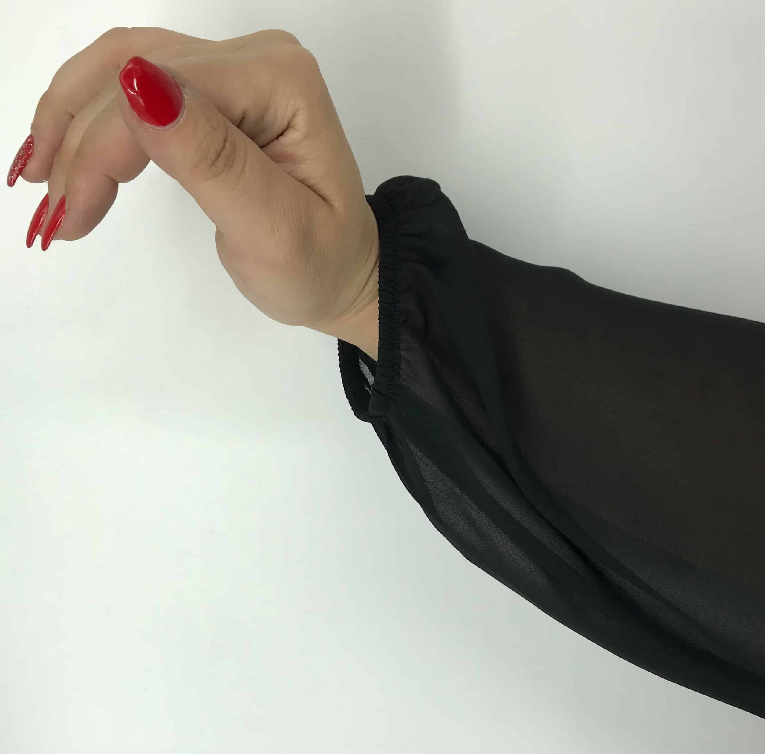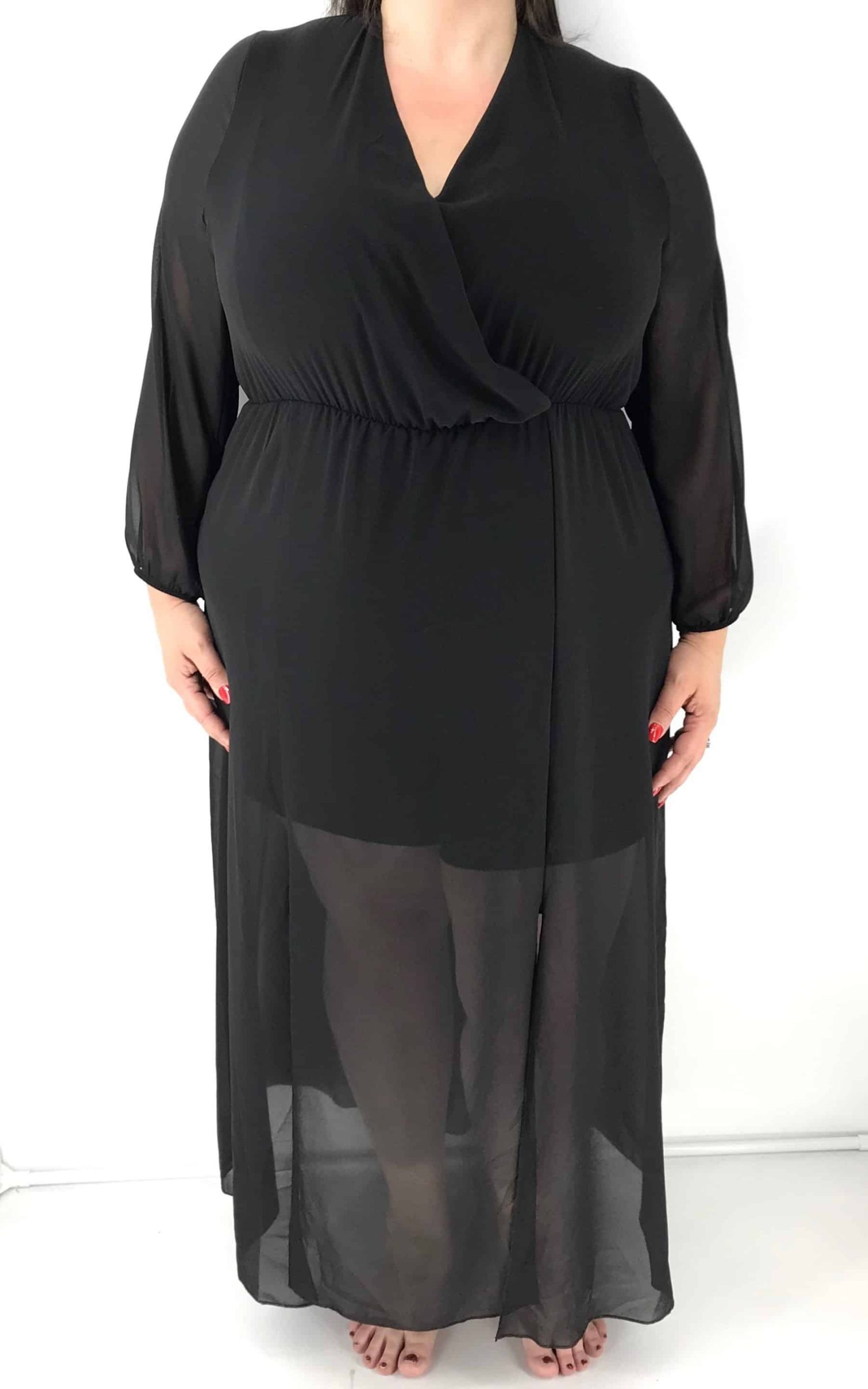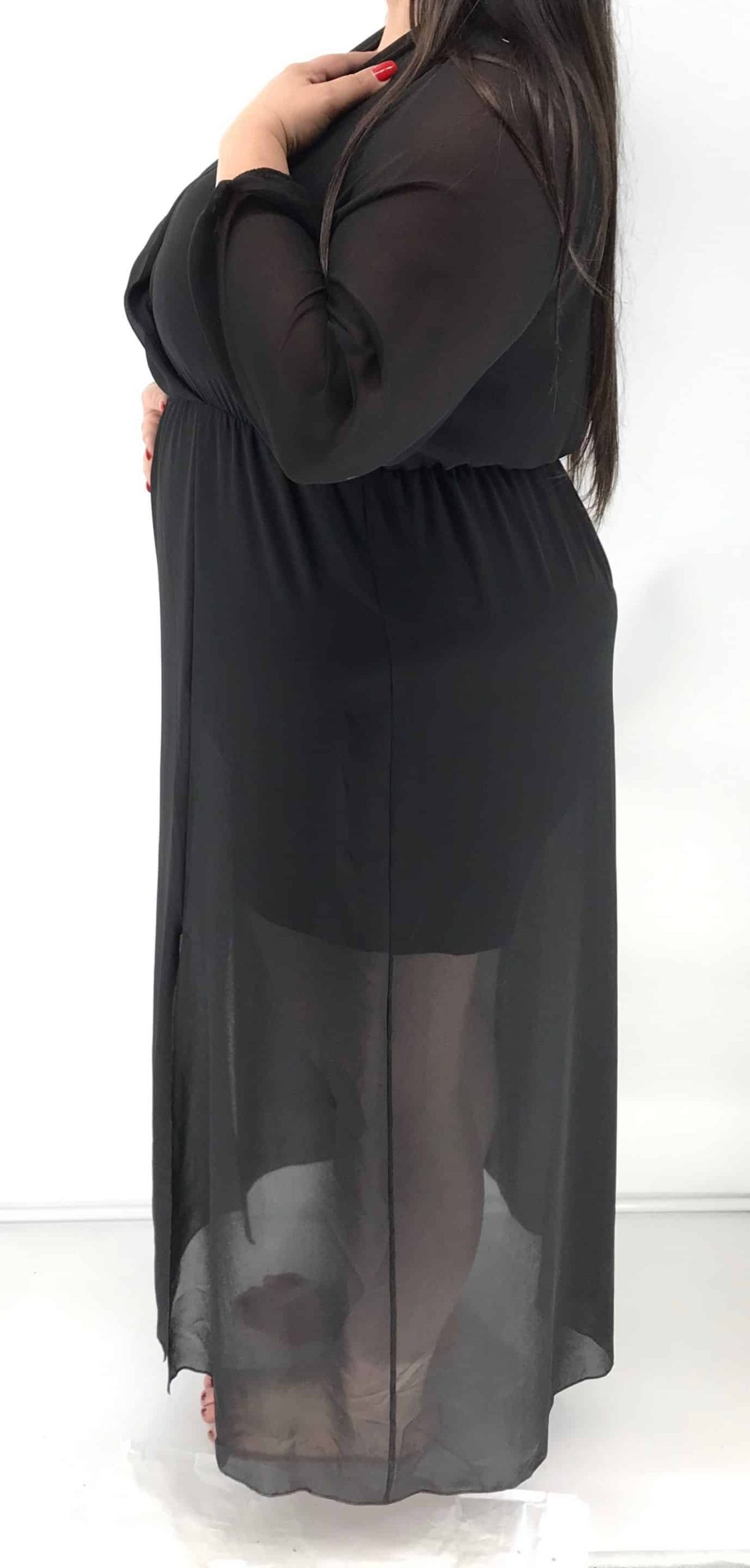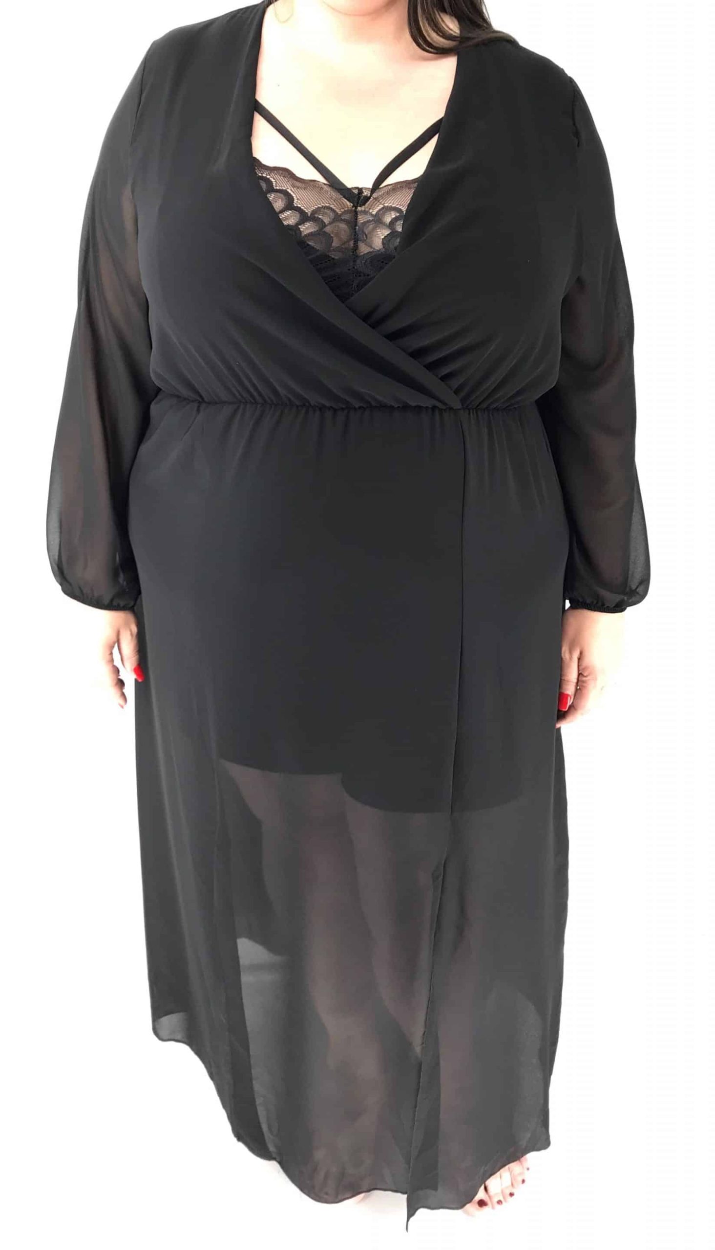 Robe longue doublée sur le haut et sur le bas. Le bas est doublé par un short. Décolleté cache coeur dont la profondeur peut se régler grâce à l’attache dans le dos. Fentes à l’avant pour un côté sensuel et plus de confort au niveau des mouvements