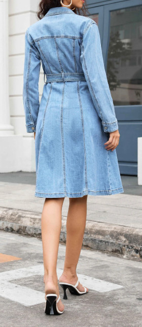 Robe en jeans manches longues. Fermeture boutons pressions. Ceinture à passants. Deux poches à l’avant.