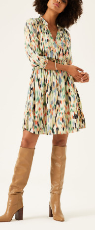 Robe cache-cœur entièrement imprimée avec des paillettes subtiles. Avec cette robe, vous êtes complètement tendance. La robe a une taille élastique, une encolure en V et une coupe classique. Cet article 98% viscose et 2% fil métallique. Lavable en machine à 30°.