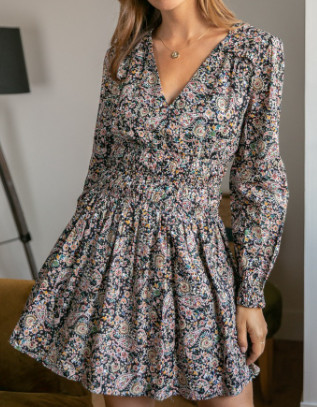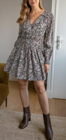 Robe manches longues avec une large taille smokée. Elatique au niveau des manches. Encolur V. Doublure au niveau du jupon.