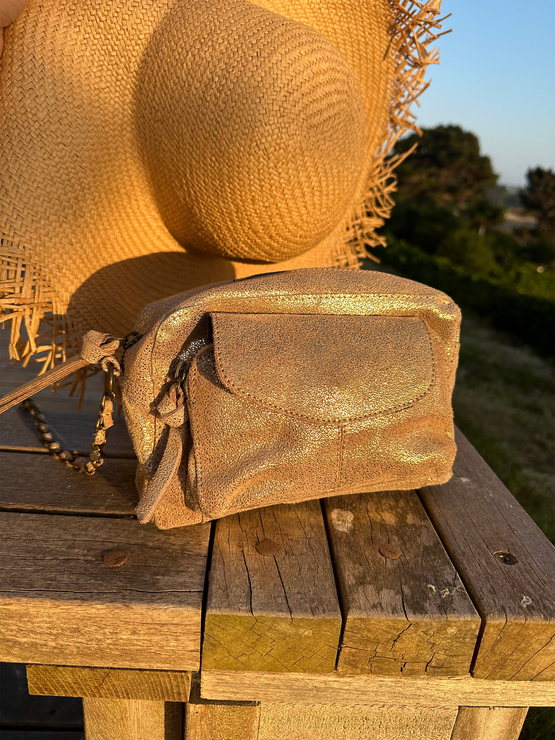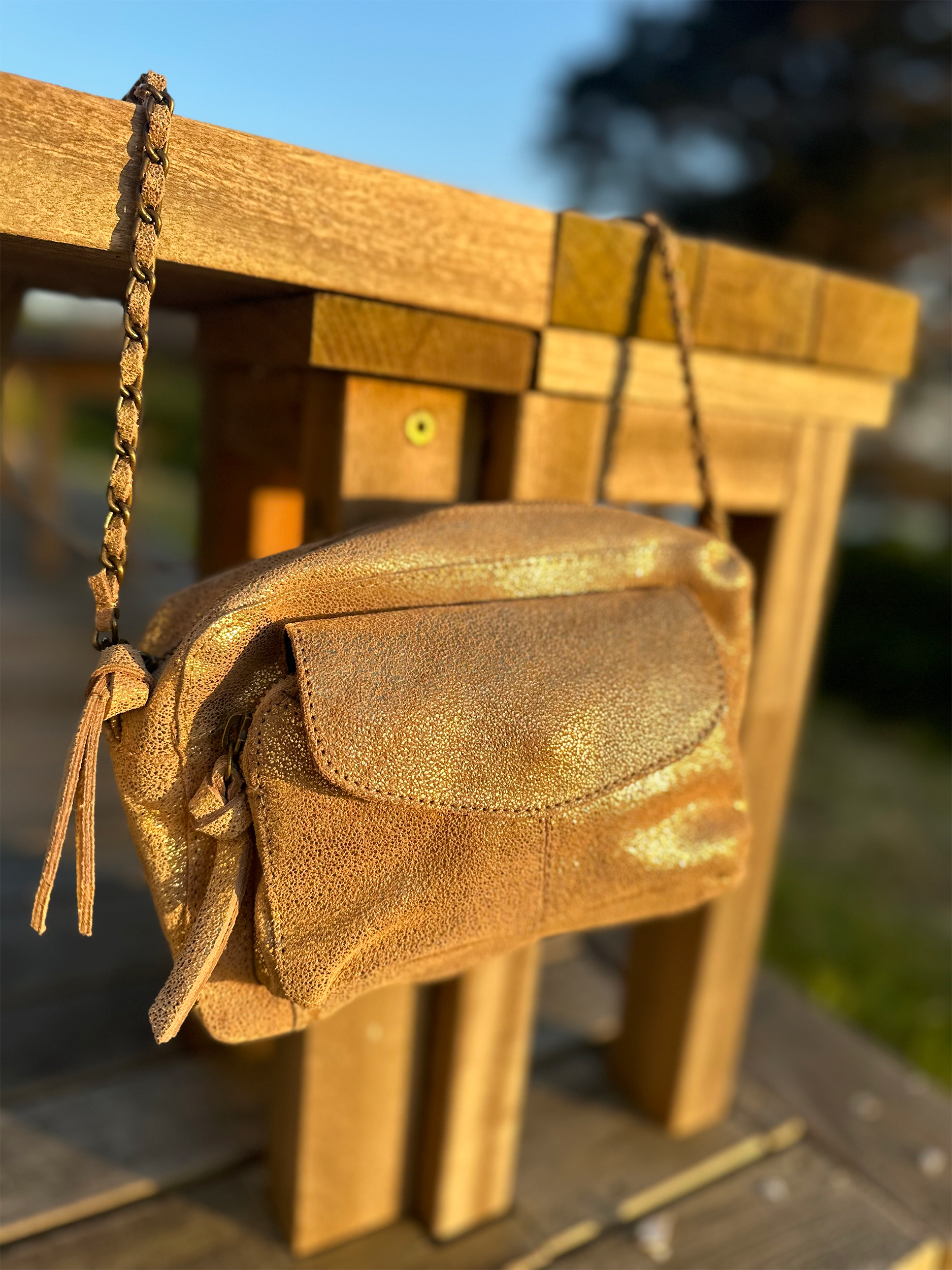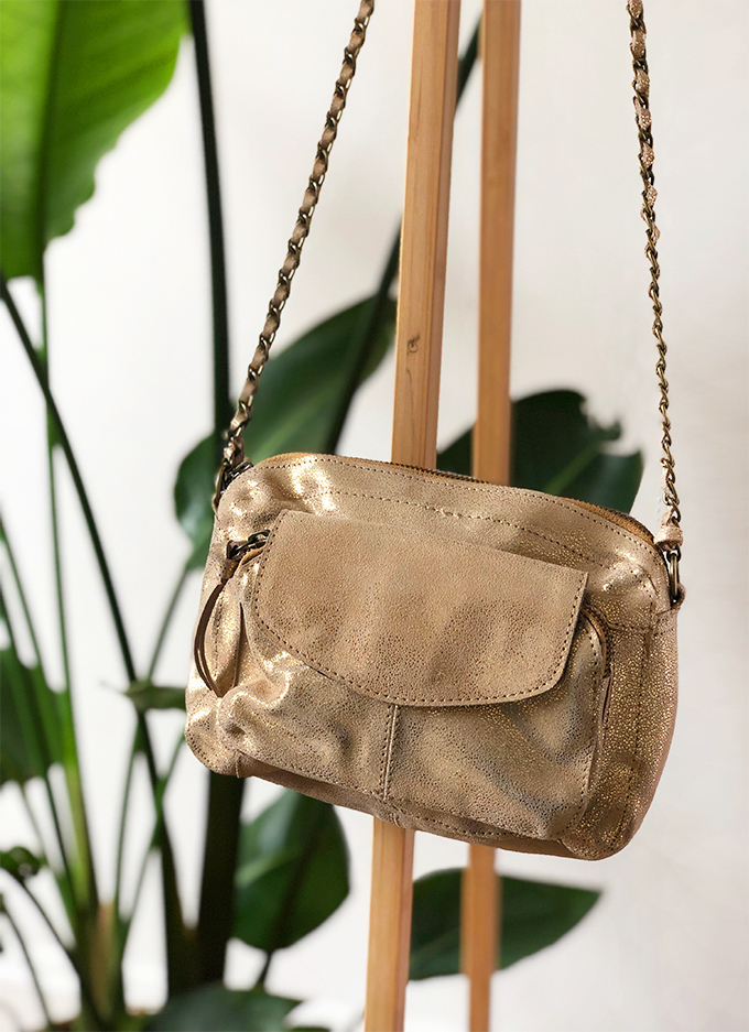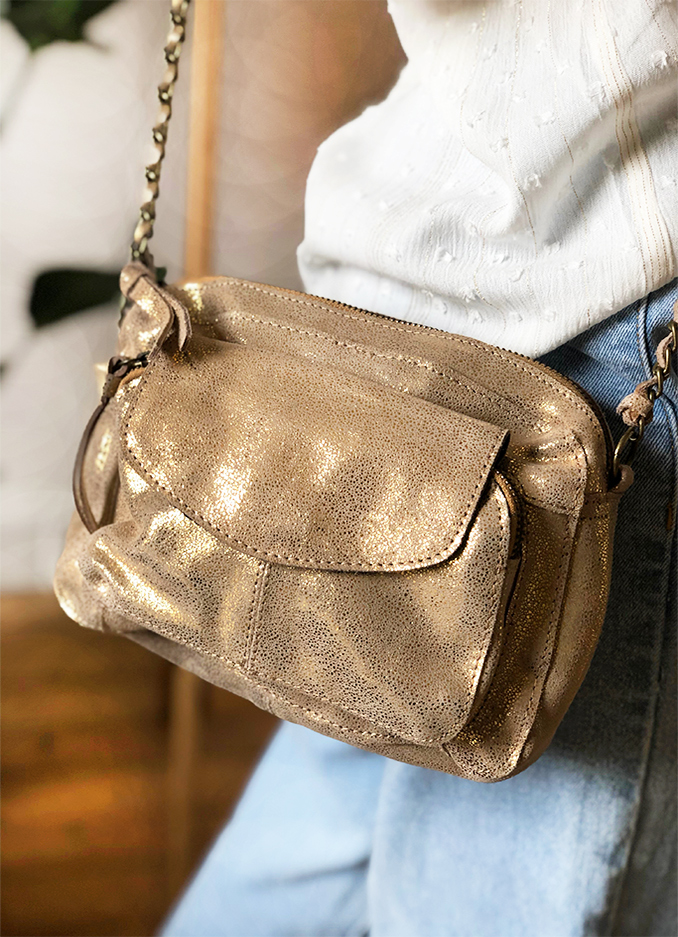 Coup de foudre pour notre sac bandoulière Narcisse qui revisite le cuir métallisé doré pour les beaux jours !