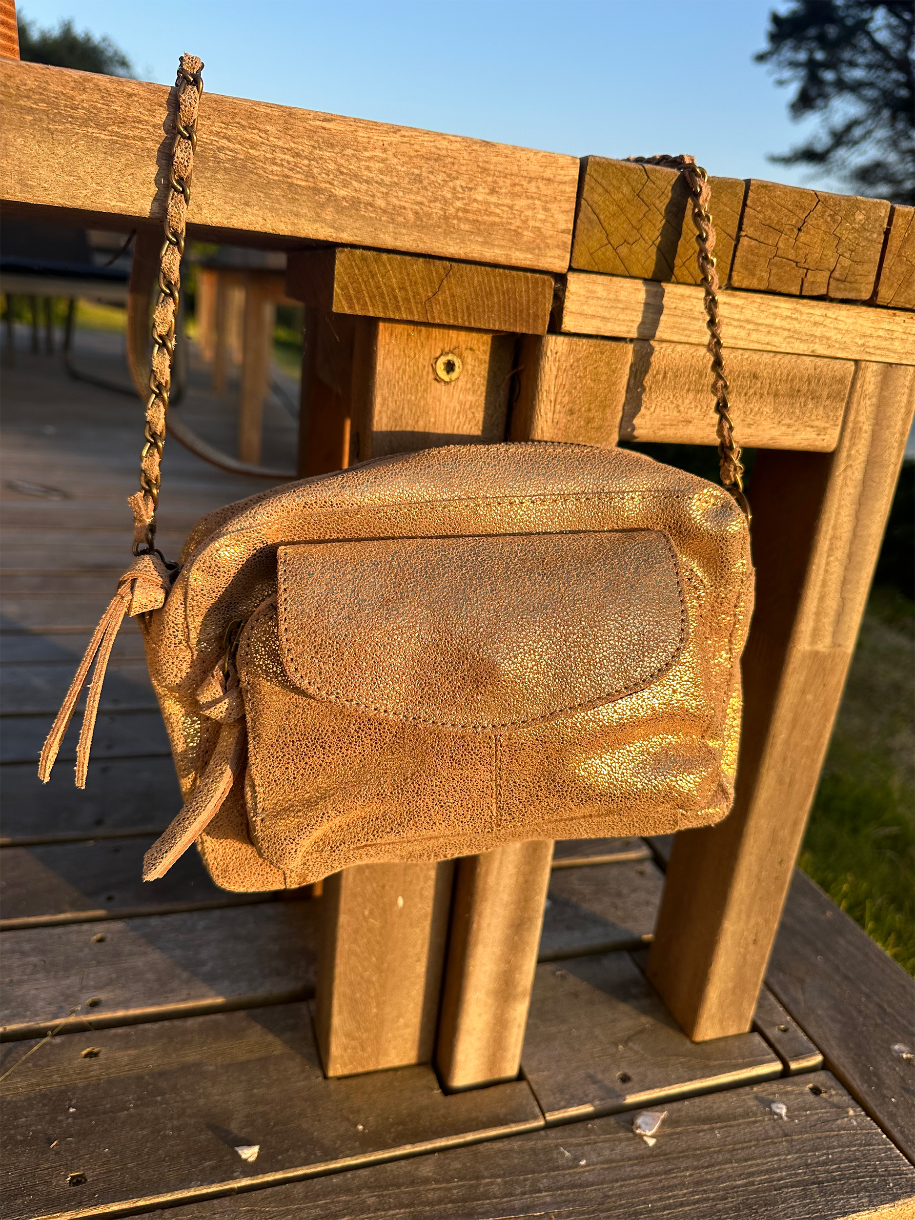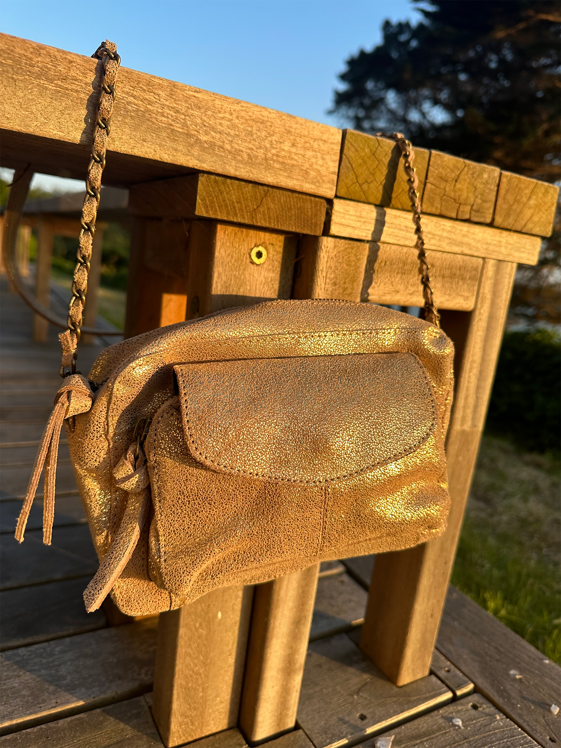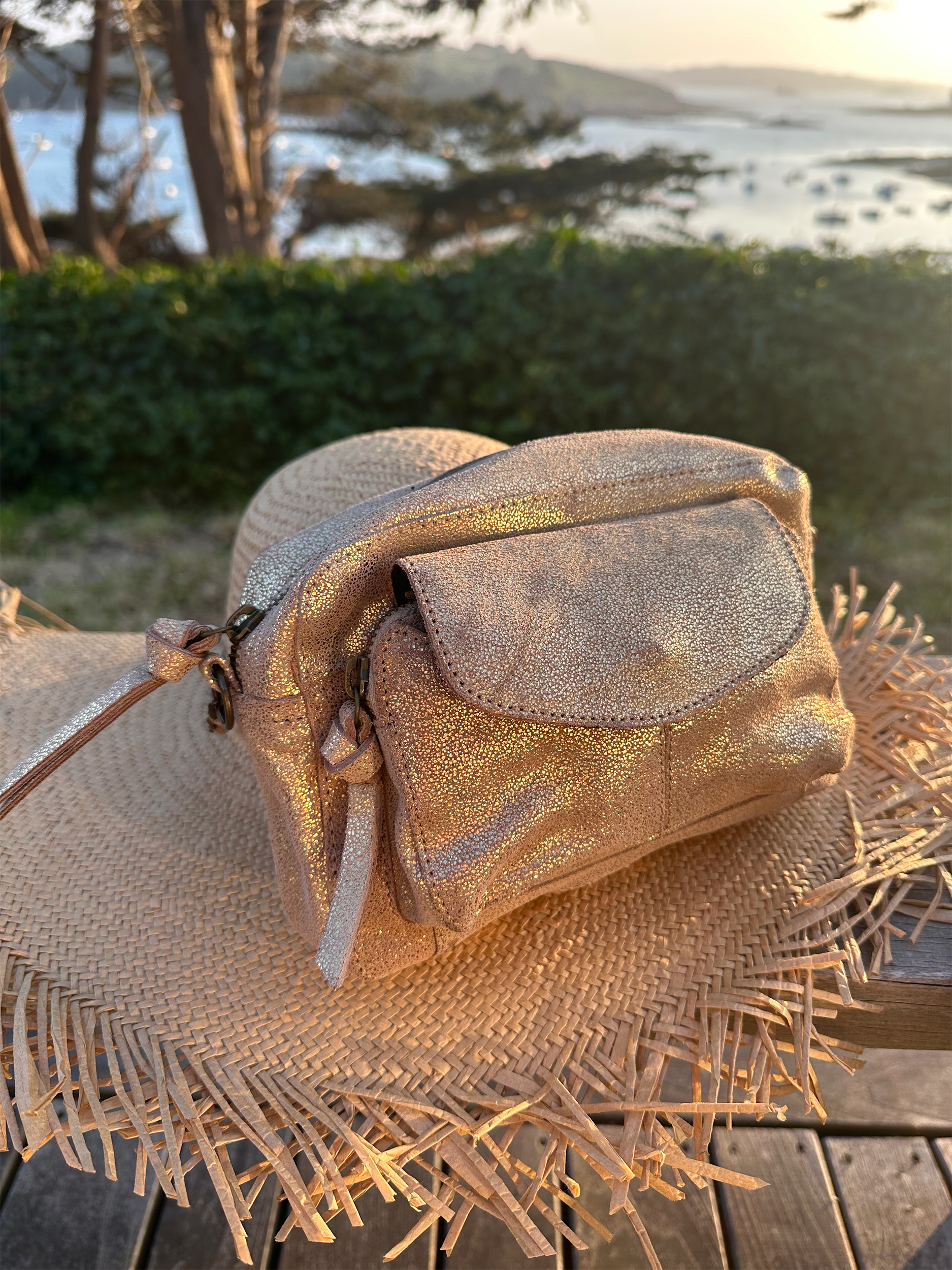 Coup de foudre pour notre sac bandoulière Narcisse qui revisite le cuir métallisé doré pour les beaux jours !