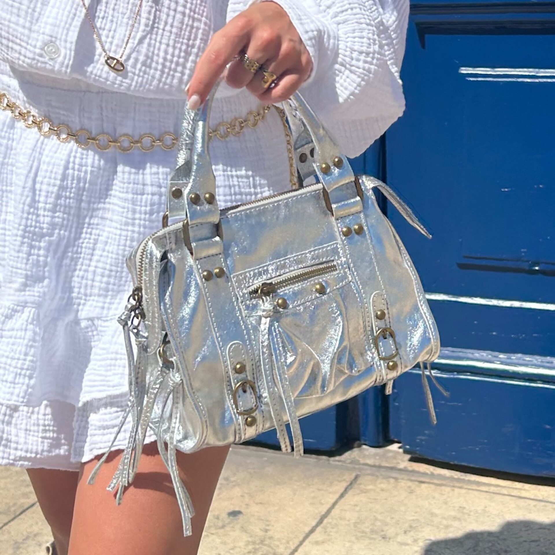 On adopte ce sac en cuir argenté pour la vie de tous les jours, il est tendance et pratique à la fois ! Son côté irisé/brillant apportera une touche originale à votre tenue ! Dimension : 24 cm x 18 cm x 13 cm.