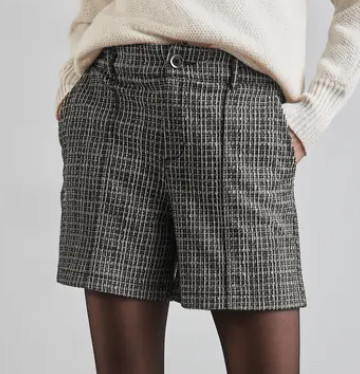 Short d’hiver aspect tweed. Coupe taille haute et décontractée. Deux poches avant. Aspect légèrement pailleté.