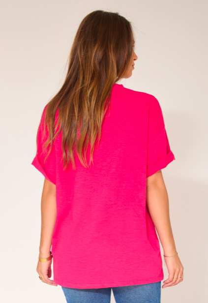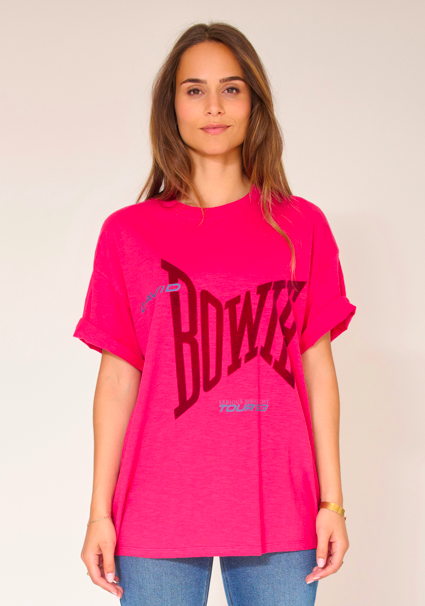 Le t-shirt officiel de Davie Bowie à la coupe loose disponible en écru et rose est en ligne pour cette collection de fêtes dingo ! Merveilleux porté avec votre jupe à sequins multicolore, la bourse en cuir rose de Taylor ainsi que le sandales à talons assorties roses !