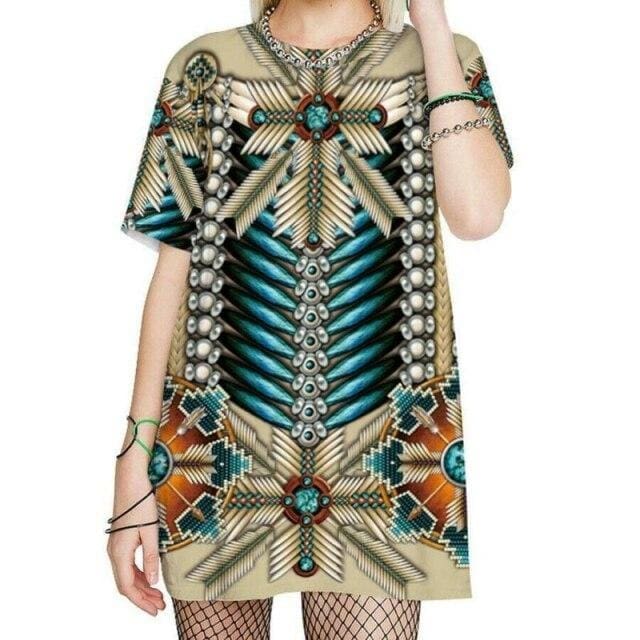 Optez pour la tendance du bleu turquoise avec notre T-shirt Indien orné de perles Anasazis pour Femme – L’élégance au rendez-vous cette saison.