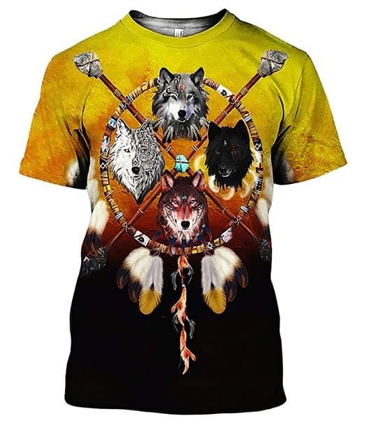 Pour les passionnés de canidés sauvages : découvrez le T-shirt aux motifs de loups inspirés de l’art amérindien !