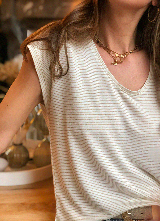 Son coloris blanc cassé illuminé par de fines rayures dorés vous ira à ravir !