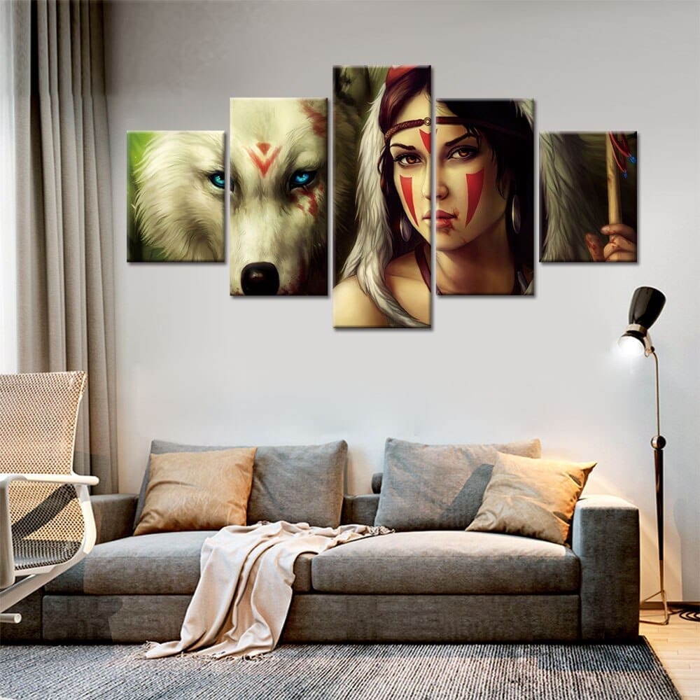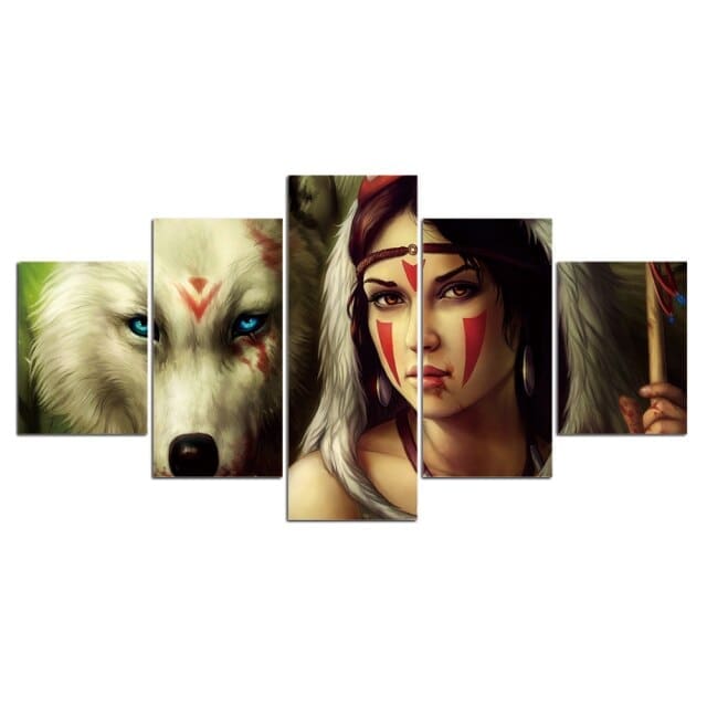 Sublimez votre décoration d’intérieur avec l’éclat d’un Tableau Indien en Cinq Parties du duo légendaire CheffeIndienne et son noble Loup Blanc.