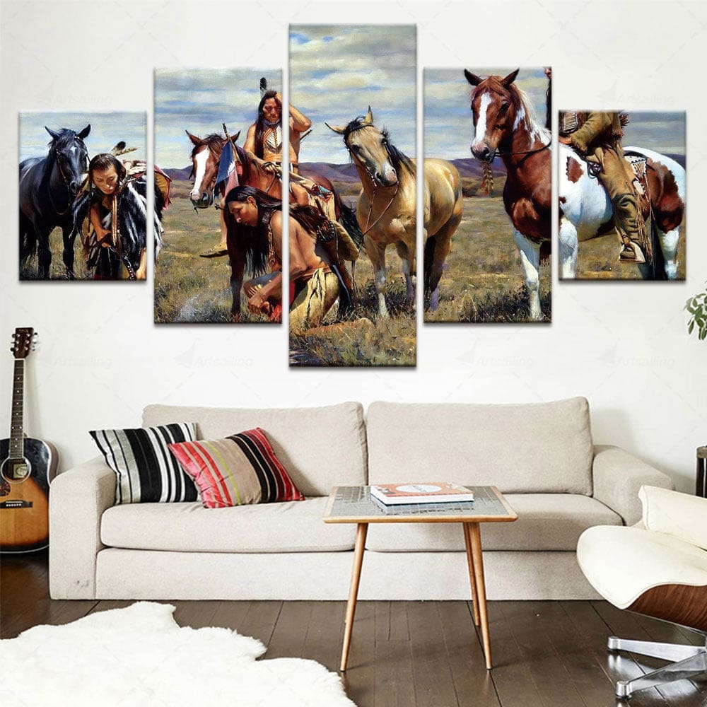 Intégrez l’Esprit des Premières Nations dans Votre Espace avec l’Œuvre d’Art ‘Esprit Équestre Tribal’ en Cinq Parties