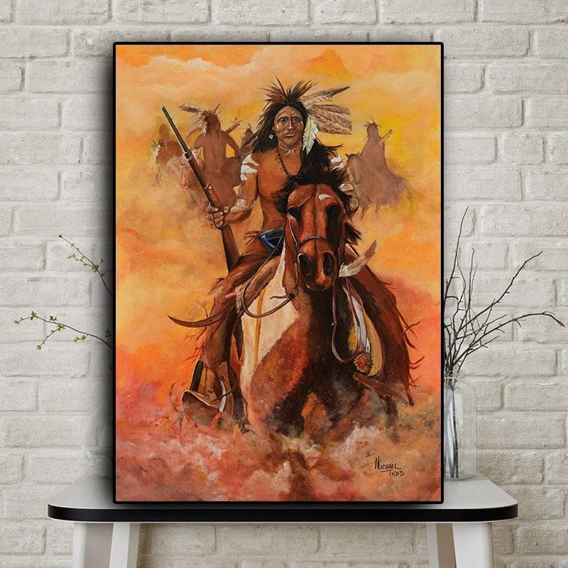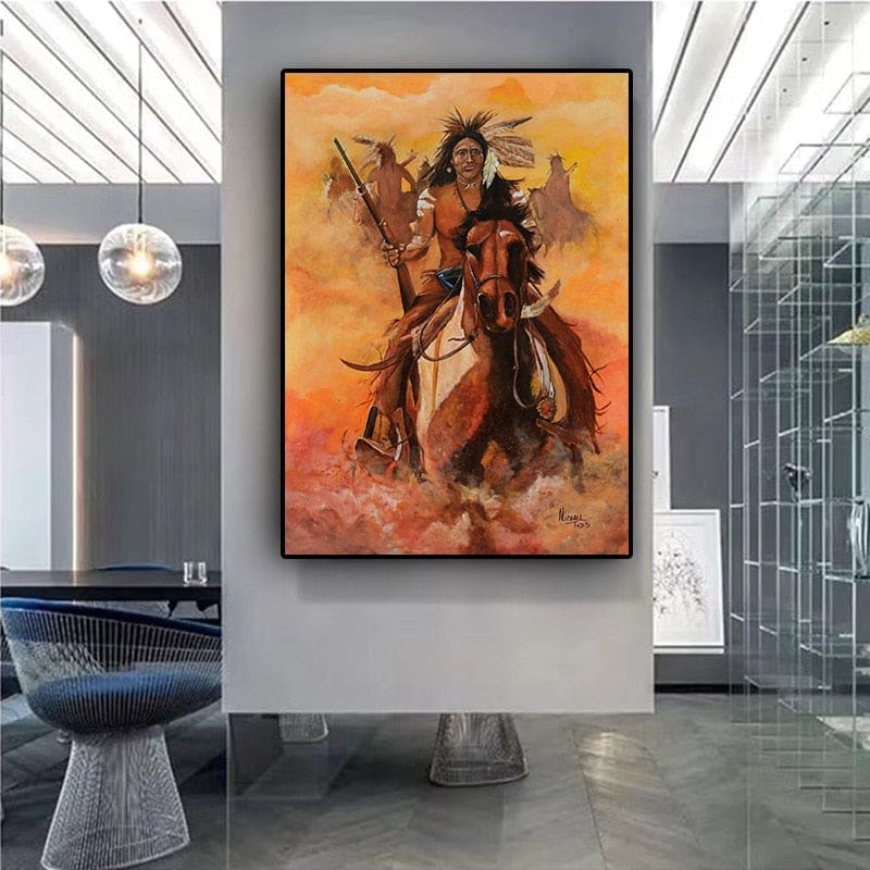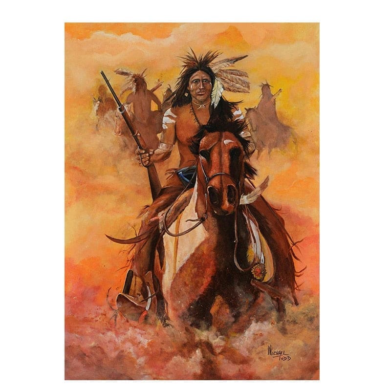 Découvrez l’œuvre captivante d’un Guerrier Indien fier sur son cheval, guidant sa Tribu Native dans la bravoure sur cette toile impressionnante