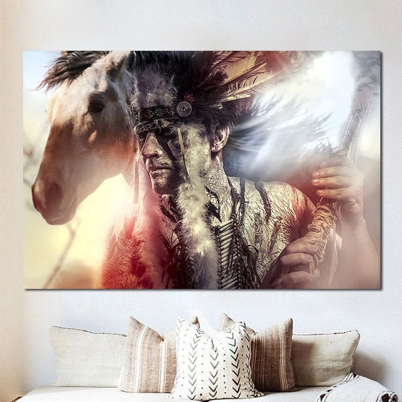 Découvrez cette Œuvre Artistique de paysage Indien aux tons brillants pour éclairer votre intérieur. Admirez l’illustration captivante d’un brave Guerrier amérindien en compagnie de son imposant destrier blanc.