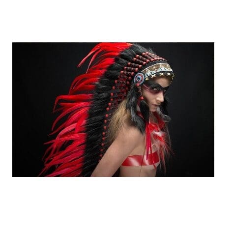 Plongez au cœur de la culture native avec notre captivante illustration d’une Indienne parée d’une somptueuse coiffe rouge, disponible en tableau. Idéale pour décorer le mur au-dessus de votre lit, cette œuvre sur fond sombre insufflera force et caractère à votre chambre.