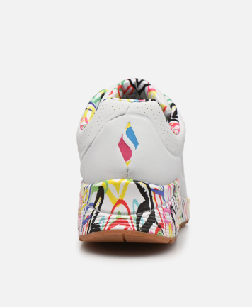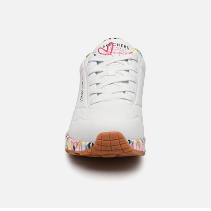 Tennis femme Semelle compensée Lacet blanc ou multicolore SKECHERS coloris blanc graffitis cœurs multicolores