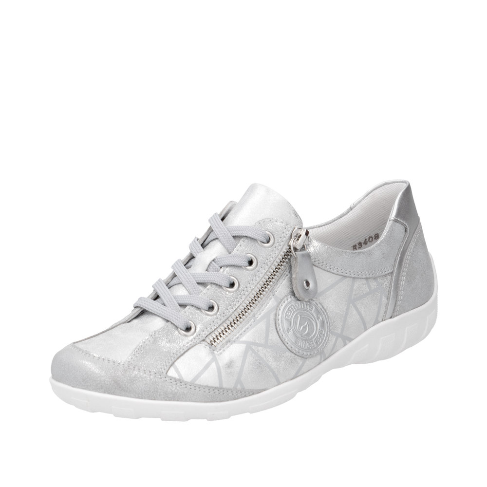Mi-chemin entre la basket et la chaussure de ville, ces tennis pour femme signées REMONTE séduisent autant par leur style que par leur confort ! Leur semelle intérieure en textile sur mousse soutien délicatement à la voûte plantaire. Le chaussant élargi au niveau des orteils garantit un confort optimal. Fabriquées dans des matériaux souples, avec une semelle extérieure flexible, ces sneakers chic et extrêmement confortables sont parfaites pour être portées tout au long de la journée. Grâce au zip, en complément du lacet argenté ajustable, les enfiler devient un jeu d’enfant. De plus, la semelle intérieure amovible peut être facilement remplacée par celle de votre choix. Pour compléter leur allure, un logo ton sur ton orne un empiècement à effet kaléidoscope, ajoutant une touche féminine.