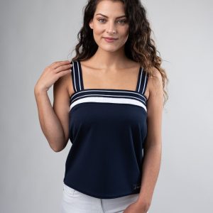 Ce Top fluide beige et sa dentelle est mis en relief par ses fines rayures blanches qui en font un style élégant et raffiné. Ce Top saura se marier avec aisance aux autres pièces de votre garde-robe. Qu’il soit associé à un jean, un pantalon, un short ou une jupe, il est facile de le mettre en valeur. Laissez vous porter par son inspiration marine.