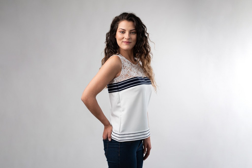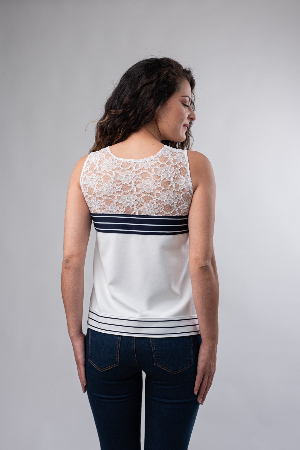 Ce Top fluide et sa dentelle beige est mis en relief par ses fines rayures blanches et bleu marine qui en font un style élégant et raffiné. Laissez vous porter par son inspiration marine.