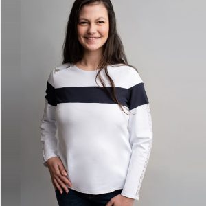 - Bande blanche avec 2 fines rayures bleu marine au dessous de la poitrine