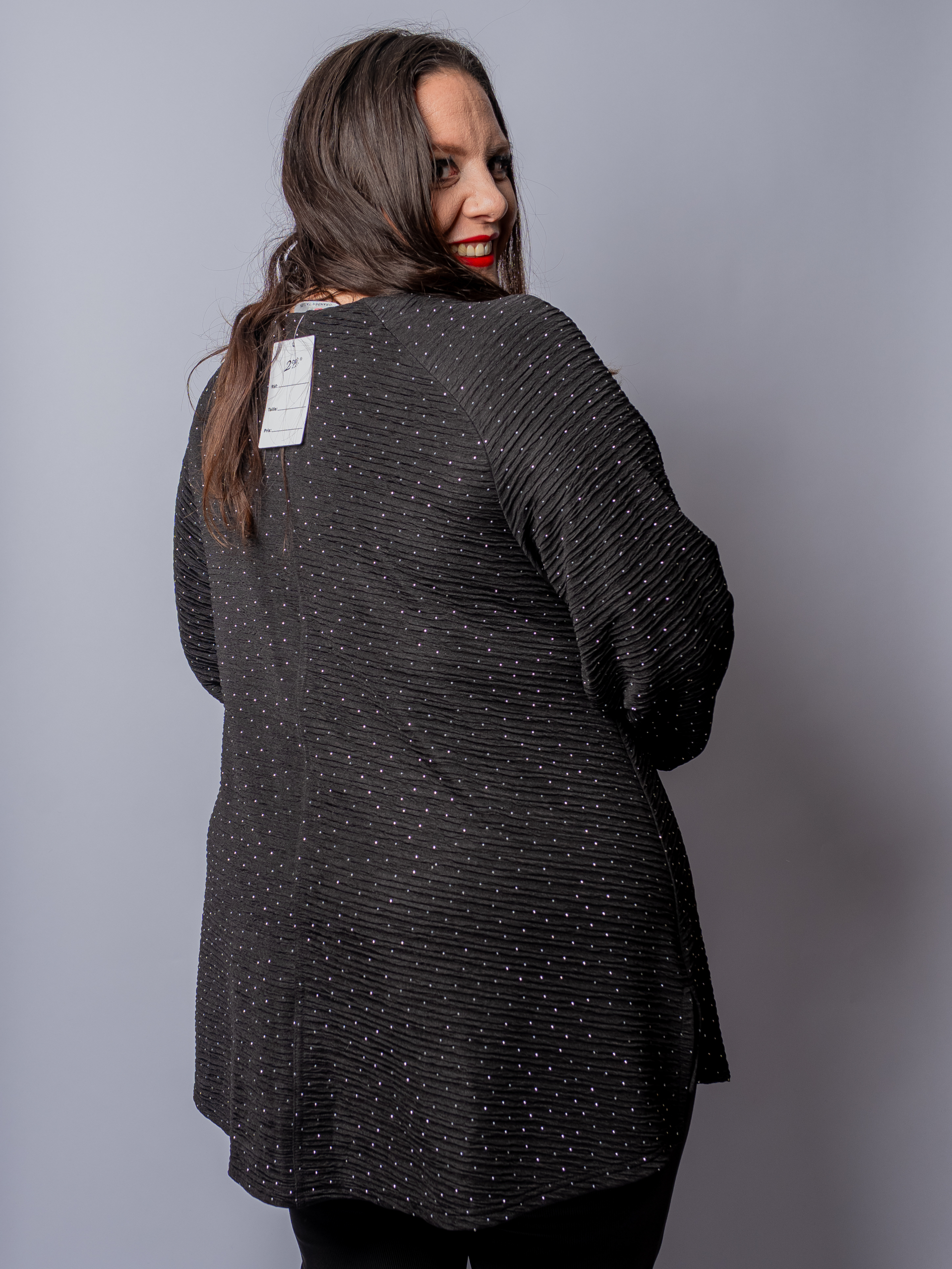 Découvrez cette tunique grande taille signée 2W Paris, une pièce qui allie sophistication moderne et confort absolu. Sa matière gaufrée texturée apporte du relief et du caractère à votre silhouette, tandis que les clous strass délicatement disposés captent la lumière et attirent tous les regards.