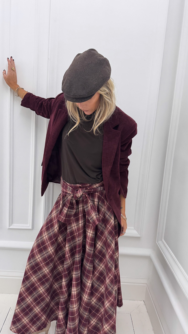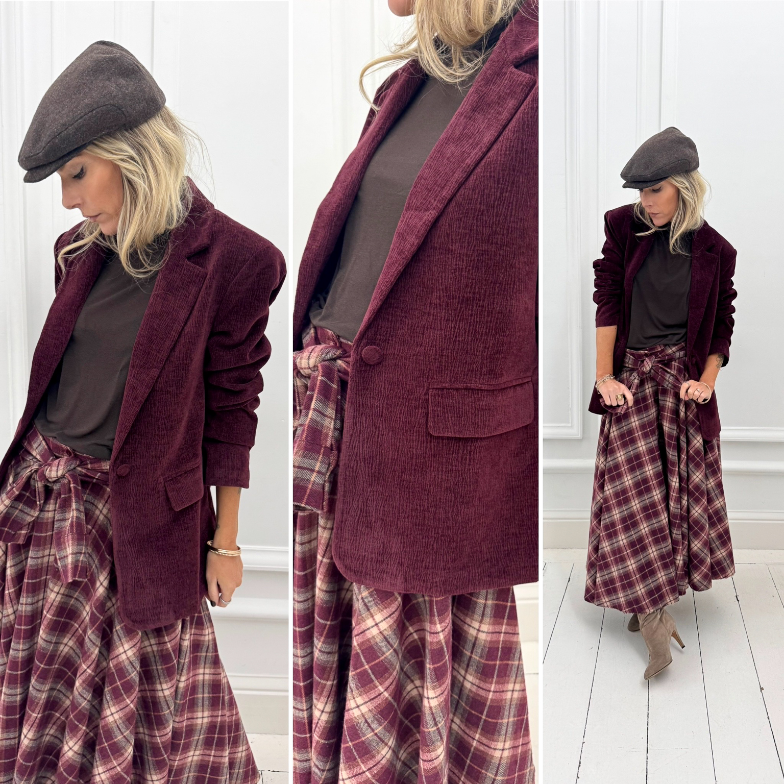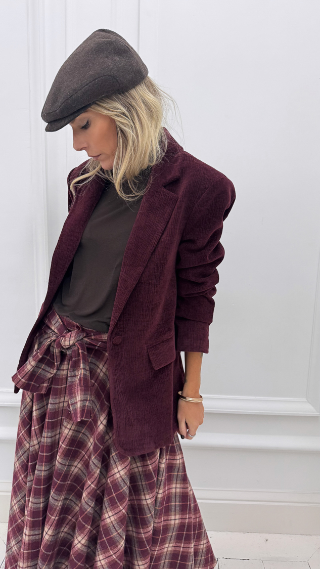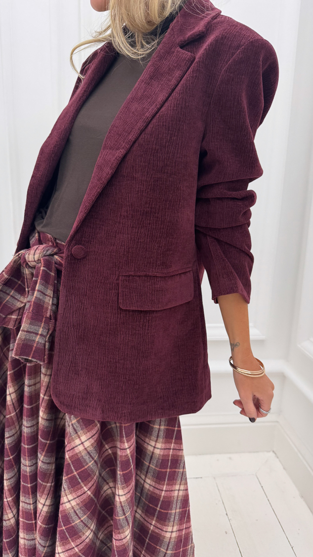 La veste blazer bordeaux en velours texturé légèrement froissé, ses poches droites à  rabats et ses épaulettes!