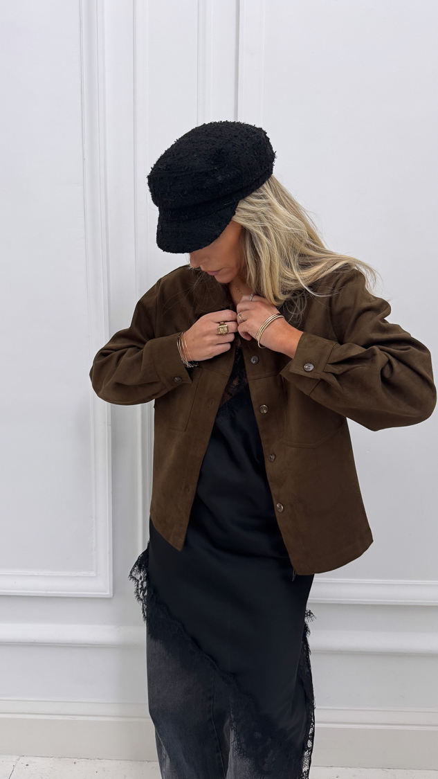 Veste en suédine chocolat, douce et élégante, avec deux poches pratiques à l’avant.